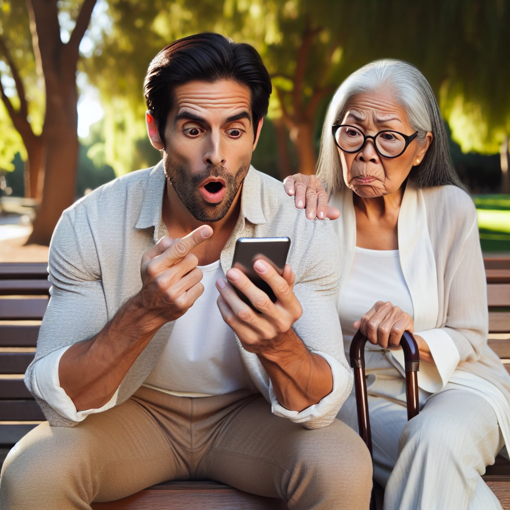 /showme bloke looking shocked at his phone screen, his old lady is rolling her eyes at him