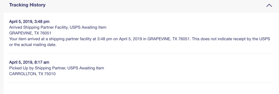 I have tracking. Grapevine Texas waiting to give to the UPS.