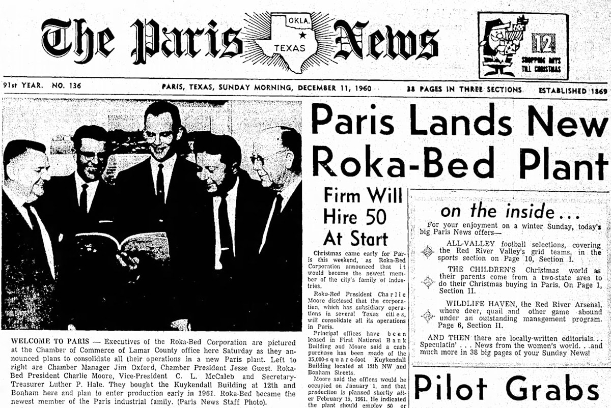 But you can’t keep a good-sounding idea down. Splashed across the front page of the Paris, Texas News on December 11, 1960 was a banner headline proclaiming that Paris had landed a new plant for a company called Roka-Bed, led by none other than C.L. McCaleb and Charlie Moore. I guess nobody bought that patent.