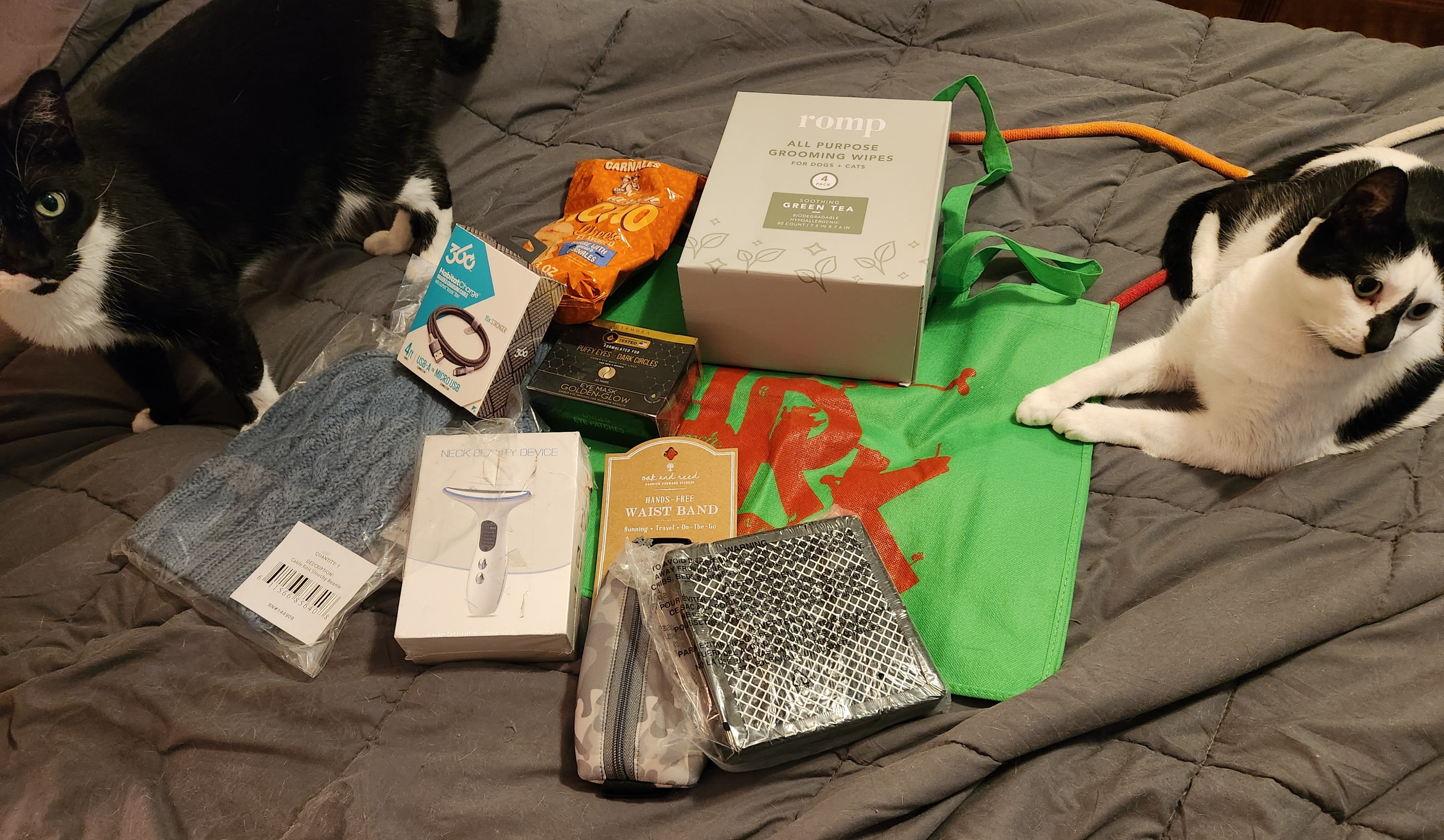 Similar to the above, except I got four Slouchy Beanies, Born Ladies Slippers, and a bag of Corn Chicharrons, a waist bag, and eye bag treatments