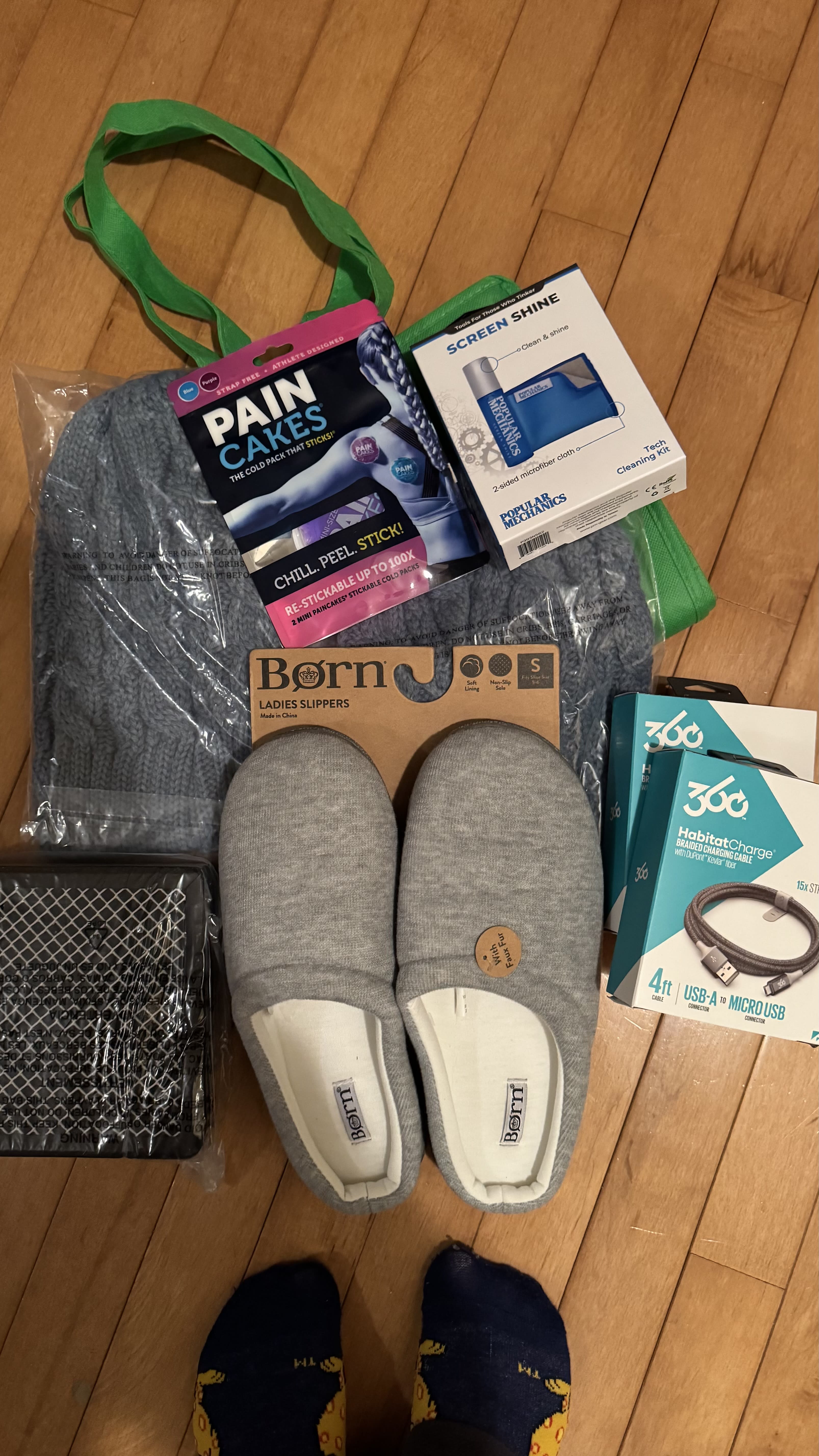Pretty much the same as @Kidsandliz’s, except 2 beanies, and 2 packs of Paincakes instead of eye masks. The slippers fit, so that’s okay.