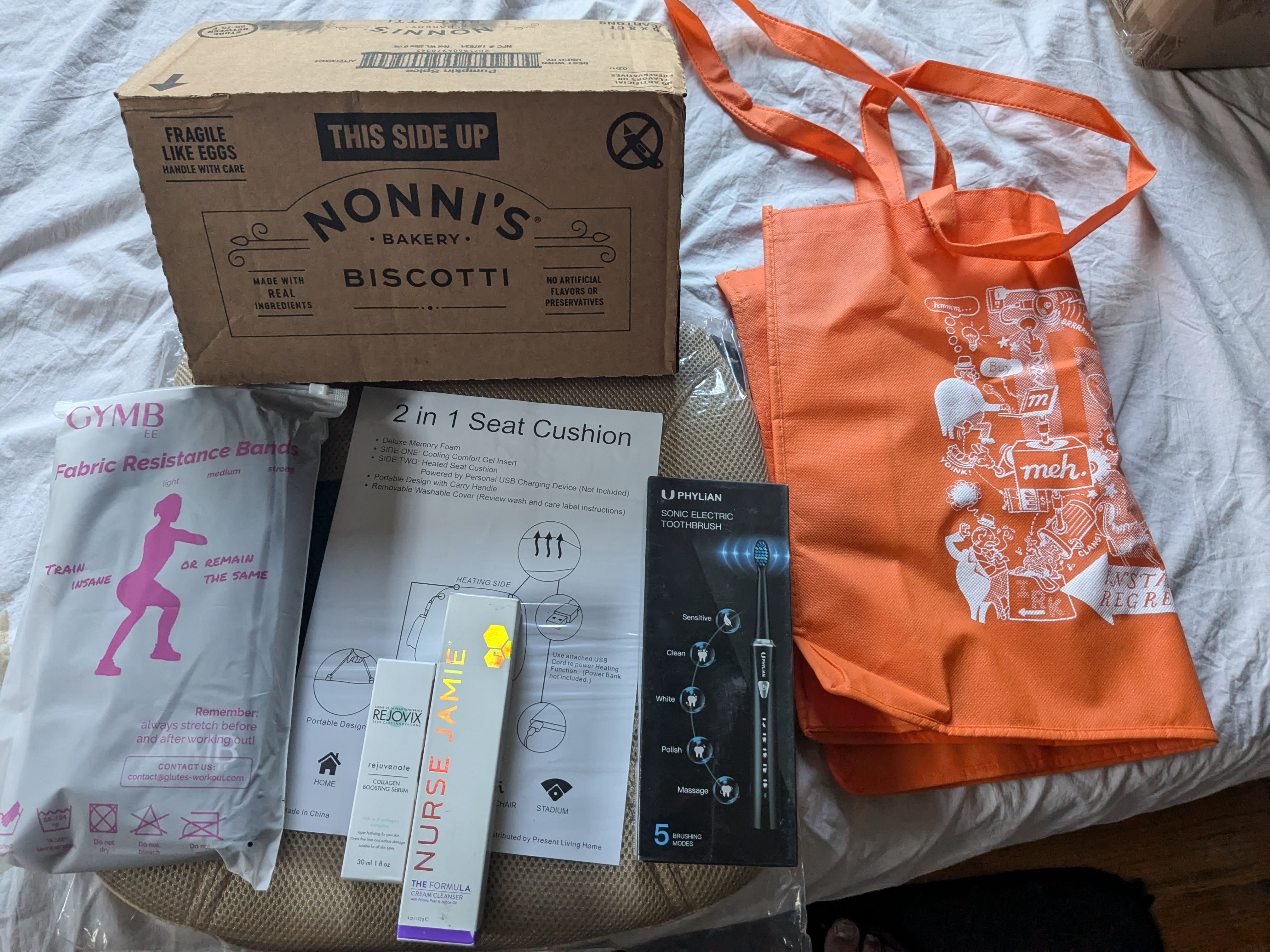 The Sharper Image thing is weird but may be useful if the heater goes out… wanted to try the food saver sheets but didnt want to pay for them… not a fan of granola or the bars but will try… gift the MS bag thing.