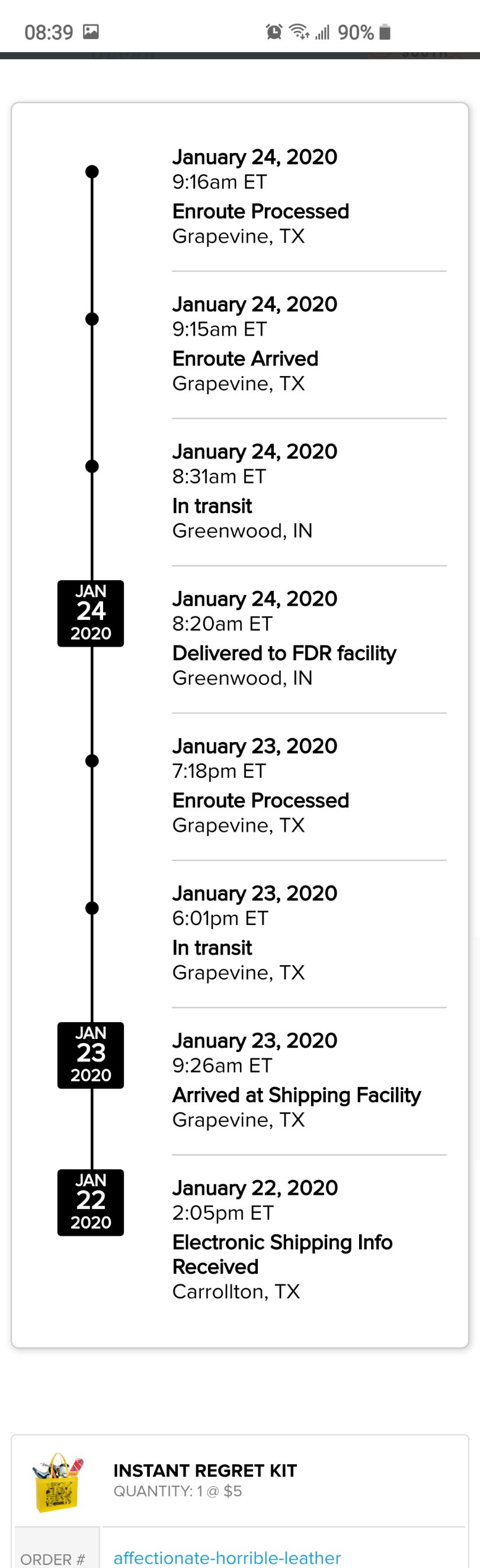 @carl669 At least you got an update on the 24th. I just checked mine and no update since the 22nd when it was in transit to Greenwood, IN. Apparently mine is walking to Greenwood. Started its journey on the 22nd like yours at about the same time. Mine is, apparently, still “in transit”.