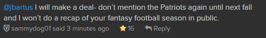 @jbartus I will make a deal- don’t mention the Patriots again until next fall and I won’t do a recap of your fantasy football season in public.