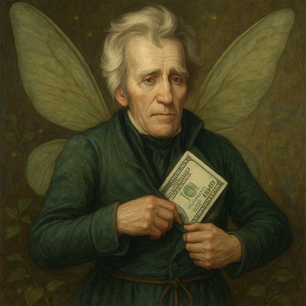 /showme fairy with face of President Andrew Jackson putting money into jacket.