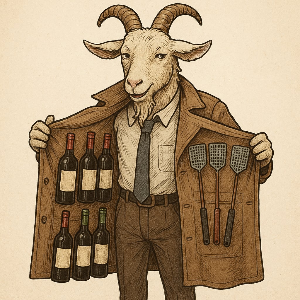 /showme anthropomorphized goat opening trench coat to show off bottles of wine and fly swatters in different pockets.