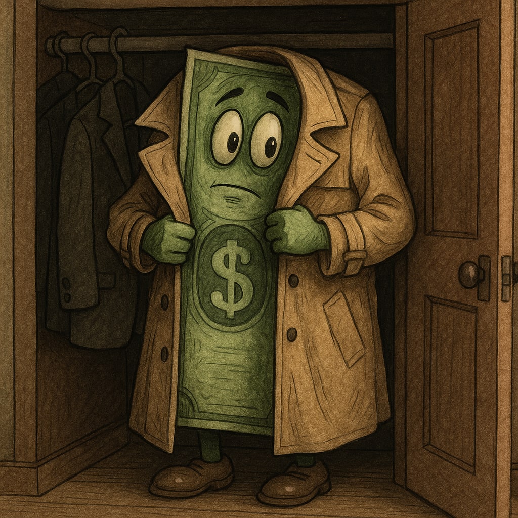 /showme anthropomorphized dollar bills hiding in trenchcoat in closet.
