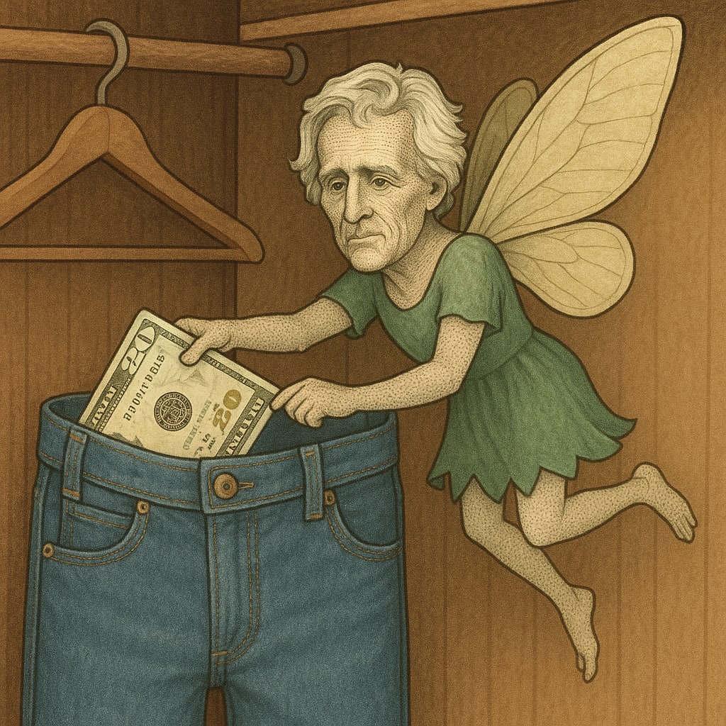 /showme fairy with face of President Andrew Jackson putting 20 dollar bill into pocket of pants hung in closet.