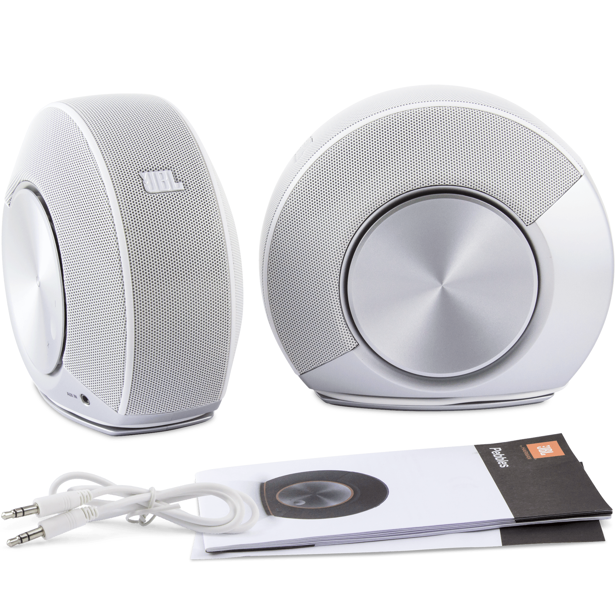 Specs ====- Model: JBLPEBBLESSILAM- Frequency response: 70Hz-20kHz- Max sensitivity: 89dB @ 1m- Transducer: 2 x 2 (50mm) Full Range- Input: 3.5mm Aux, USB 2.0 plug-and-play- Plug into USB on your computer or a USB wall outlet for power- Built-in 32" cable from speaker to USB, built-in 33" cable from left speaker to right speaker, and extra 20" aux-in cable Condition: NewWarranty: 1 Year JBLEstimated Delivery: 3/12 - 3/16Shipping: $5 or free with VMP What’s in the Box? ====1x Pair JBL USB speakers1x Audio cable1x Quick start guidePictures ====The setRetail boxIncludedSide viewsLaptop for scalePrice Check ====$50.35 at Amazon$59.95 List, $49.95 at JBL