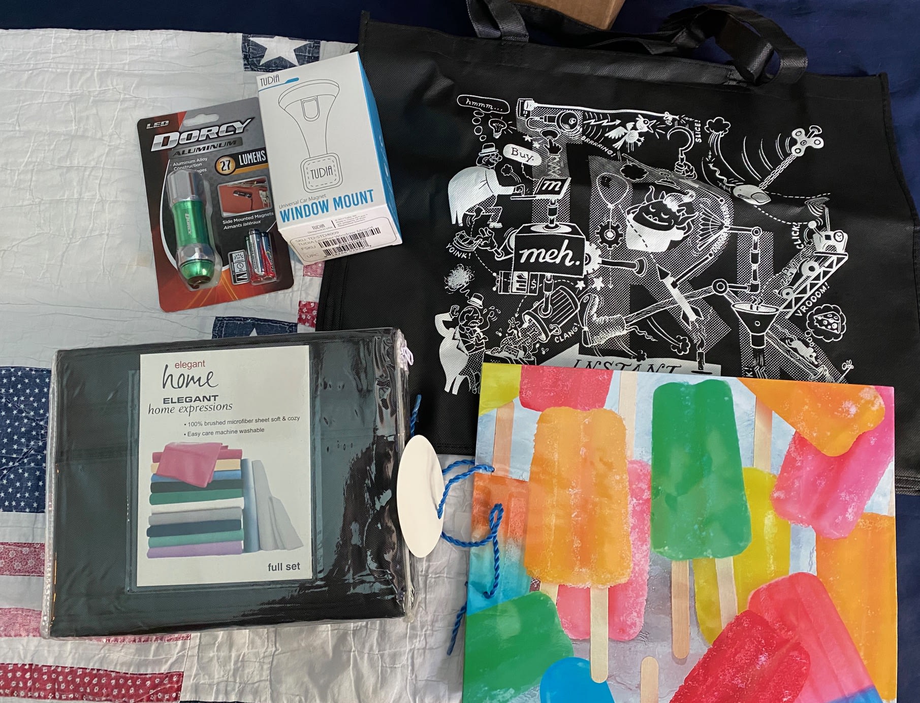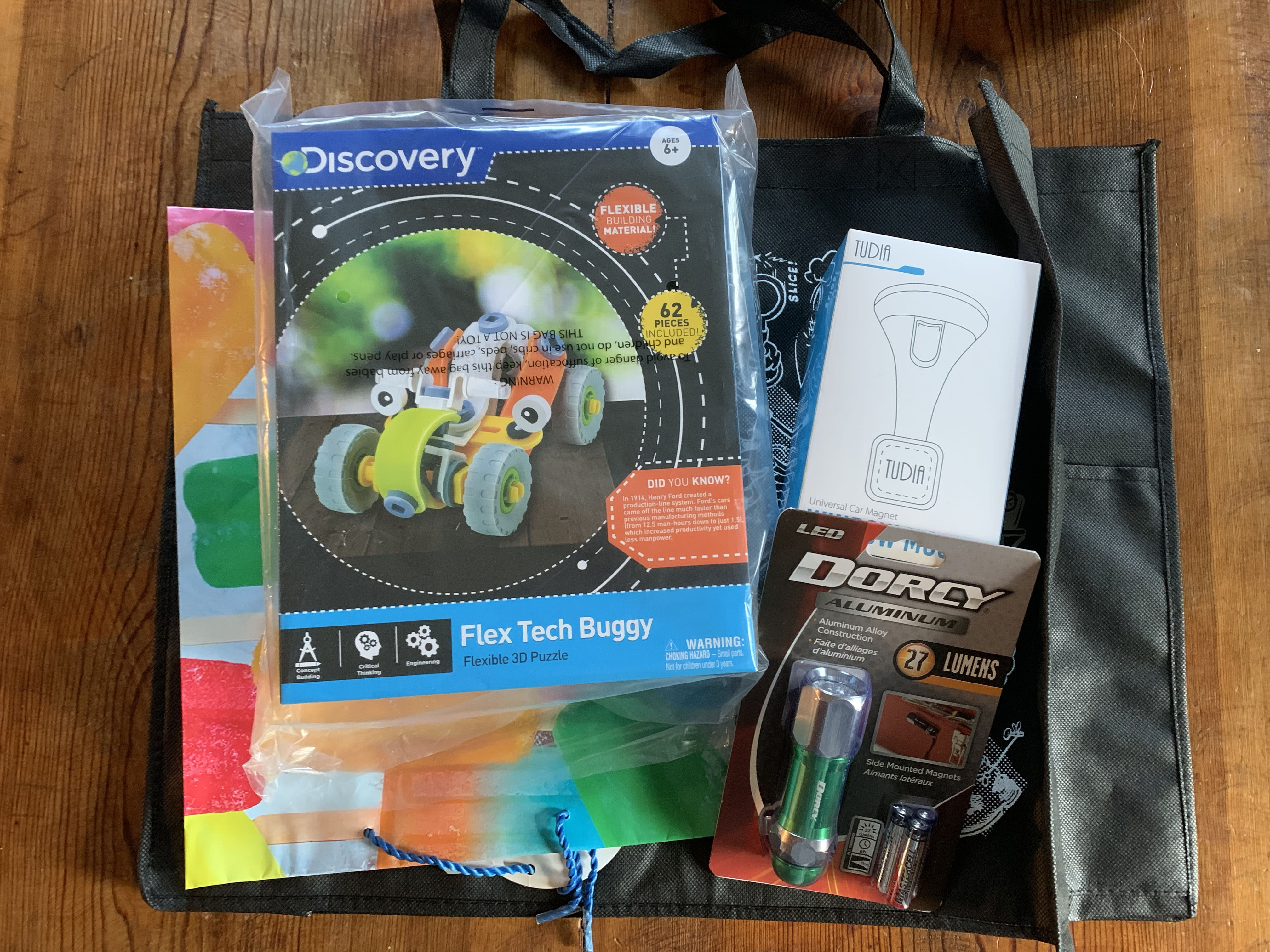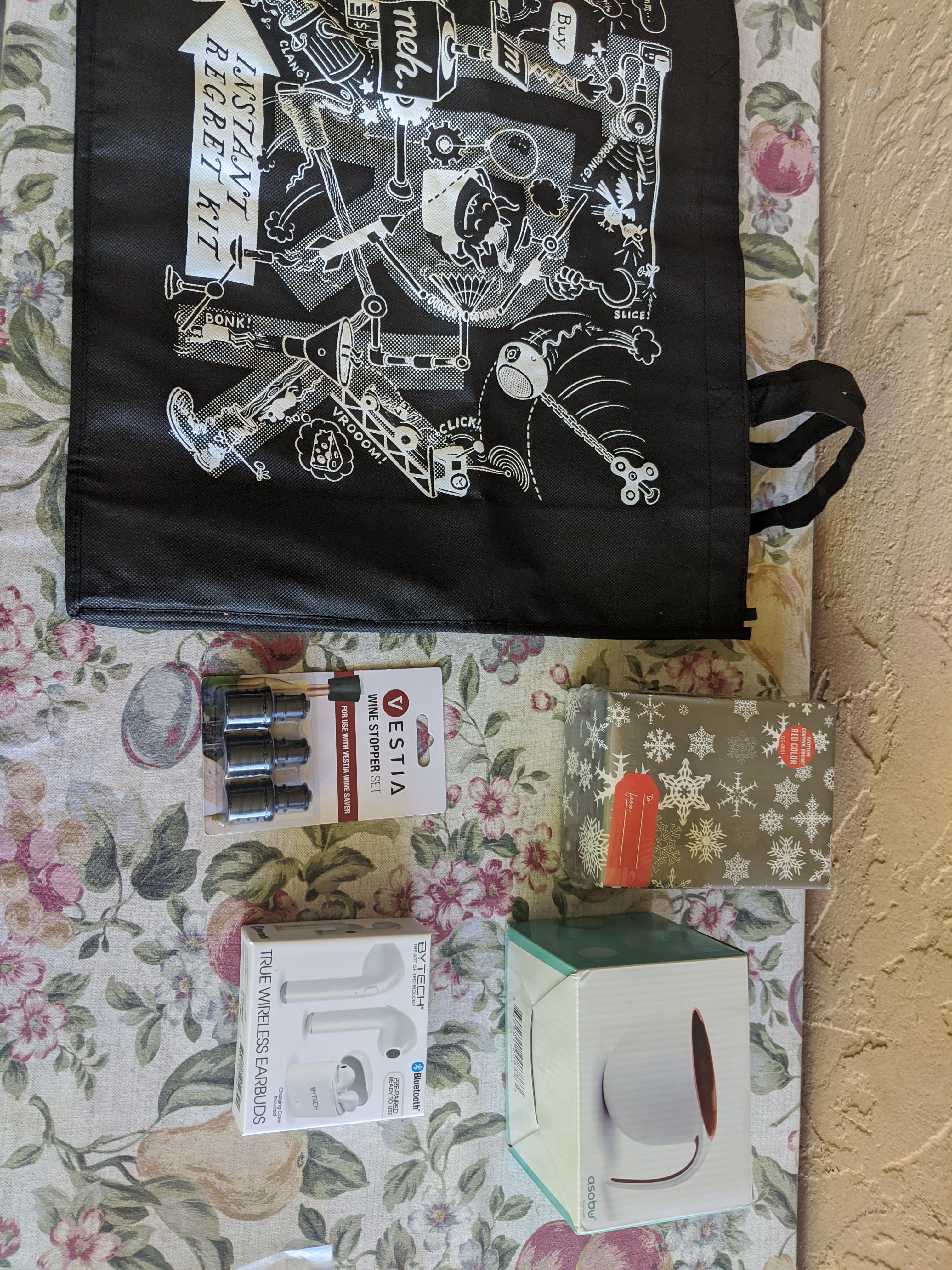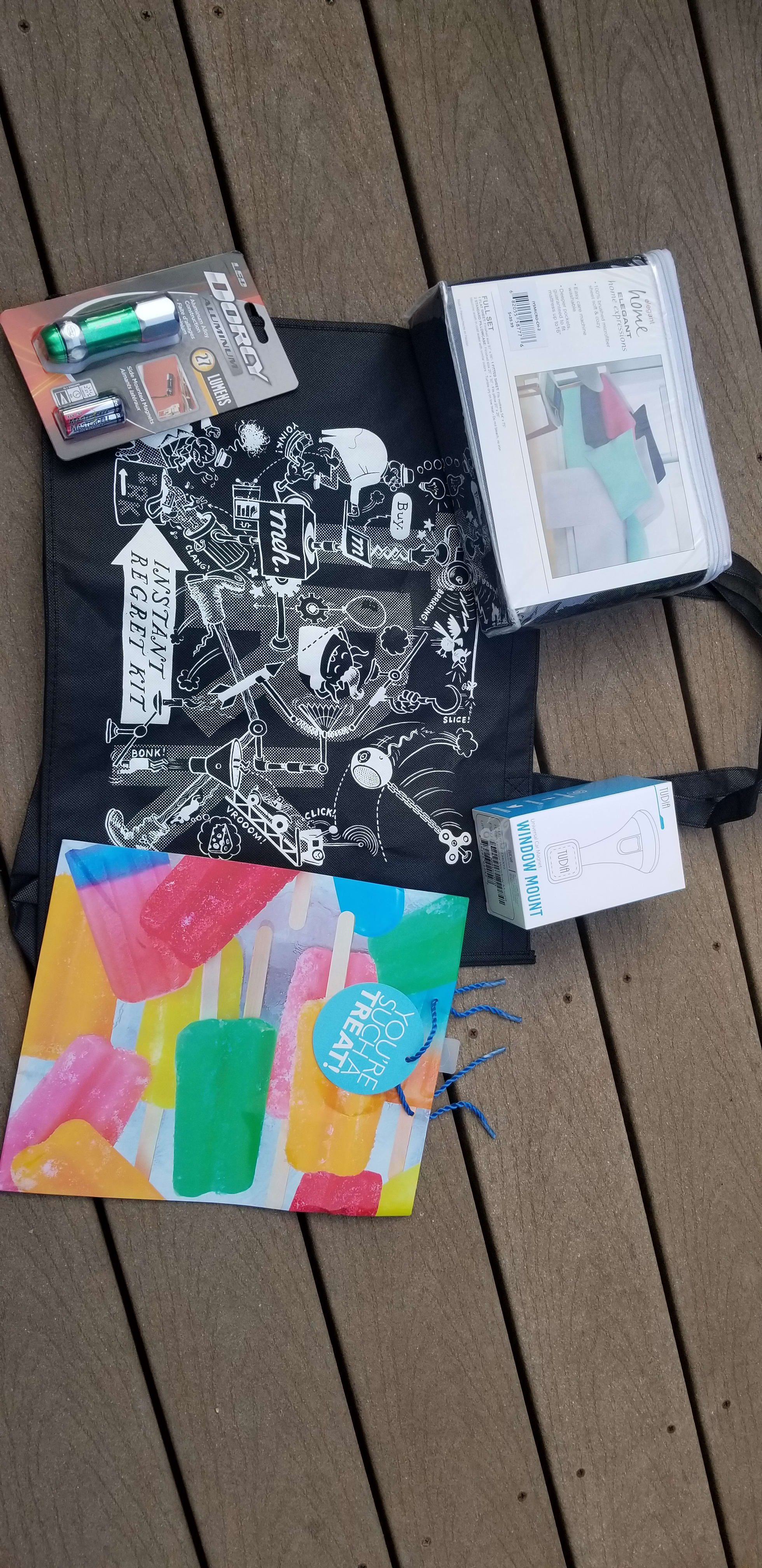 My mother in law took the tote, gift bag, and phone mount. I took the flashlight. Goldendoodle took the shipping box. First time I’ve ever found enough poor souls to take all of the shit in the box. All in all pretty successful irk!