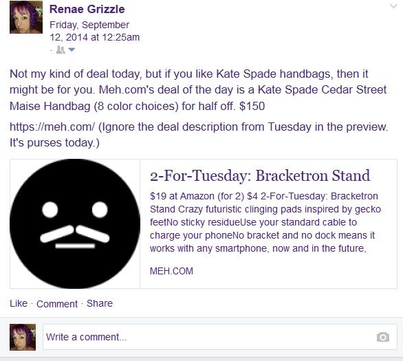 This is the second day in a row that I've shared the day's deal and it's not previewed correctly. Yesterday, there was no thumbnail, but the description was correct, at least. This, however, is a mess. Work with me here, Meh! You want us to help you grow the site, then you gotta give us something semi-professional to work with.