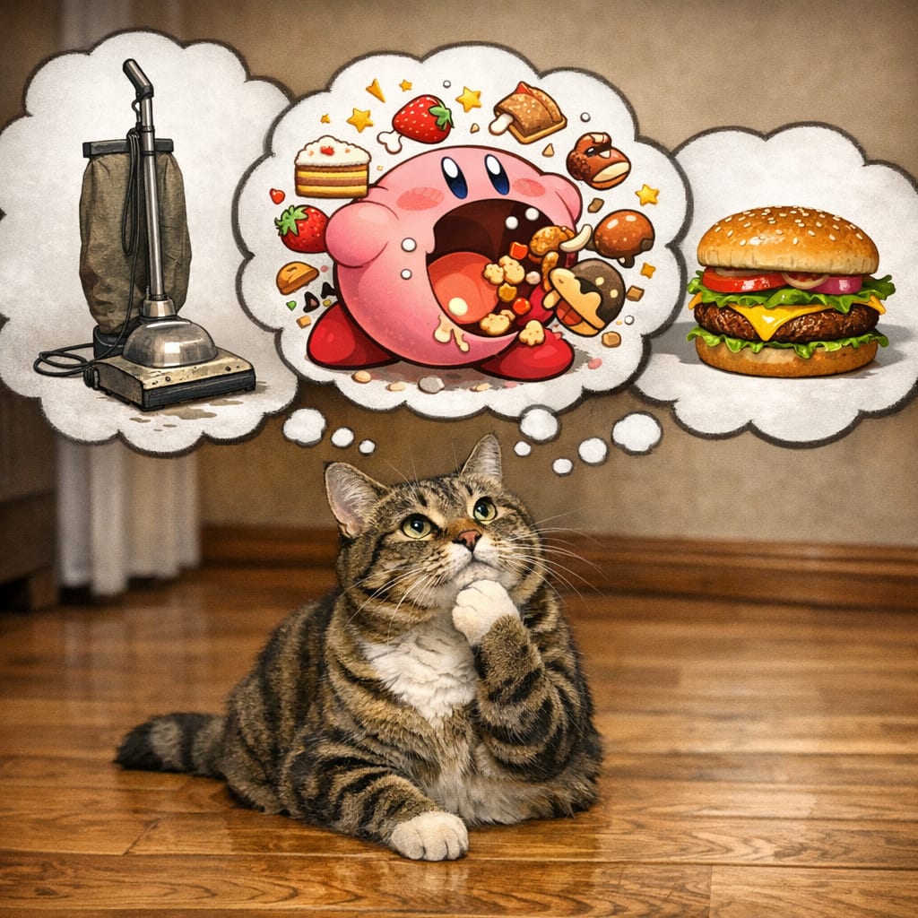 /showme a cat pondering an old metal upright vacuum cleaner in one thought bubble, a round pink video game character eating everything in sight in a second thought bubble, and a cheeseburger in a third thought bubble.