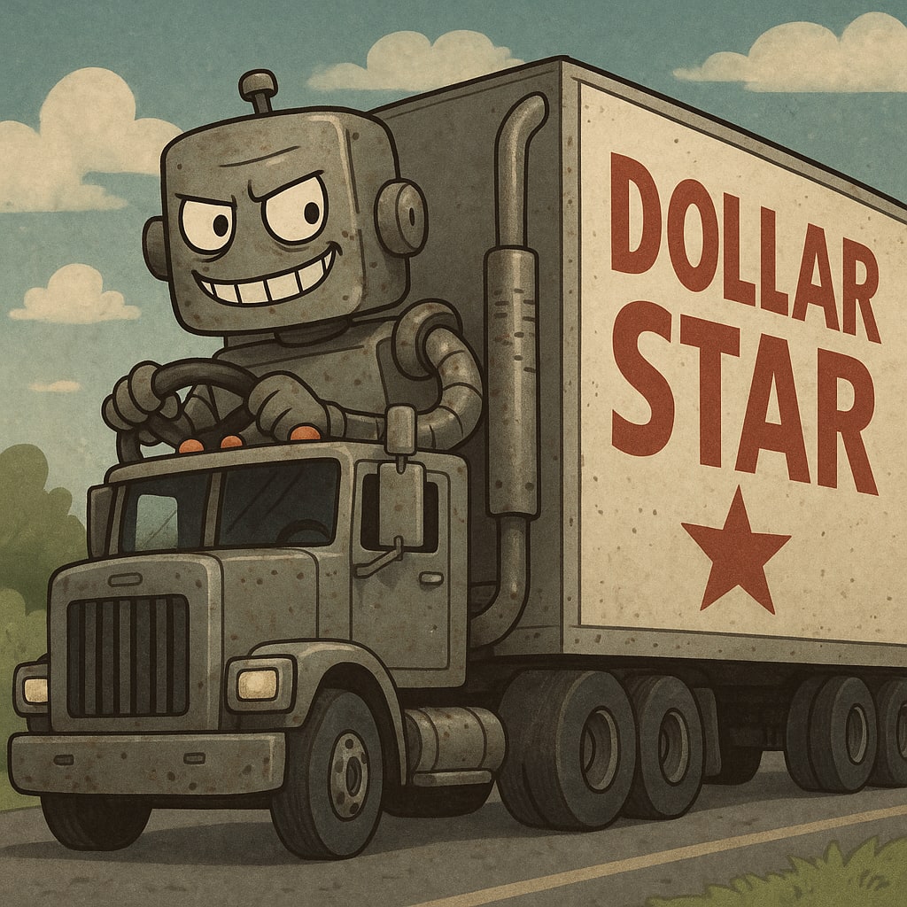 /showme mediocre-bot driving a stolen semi from Dollar Star with a malicious grin on his face