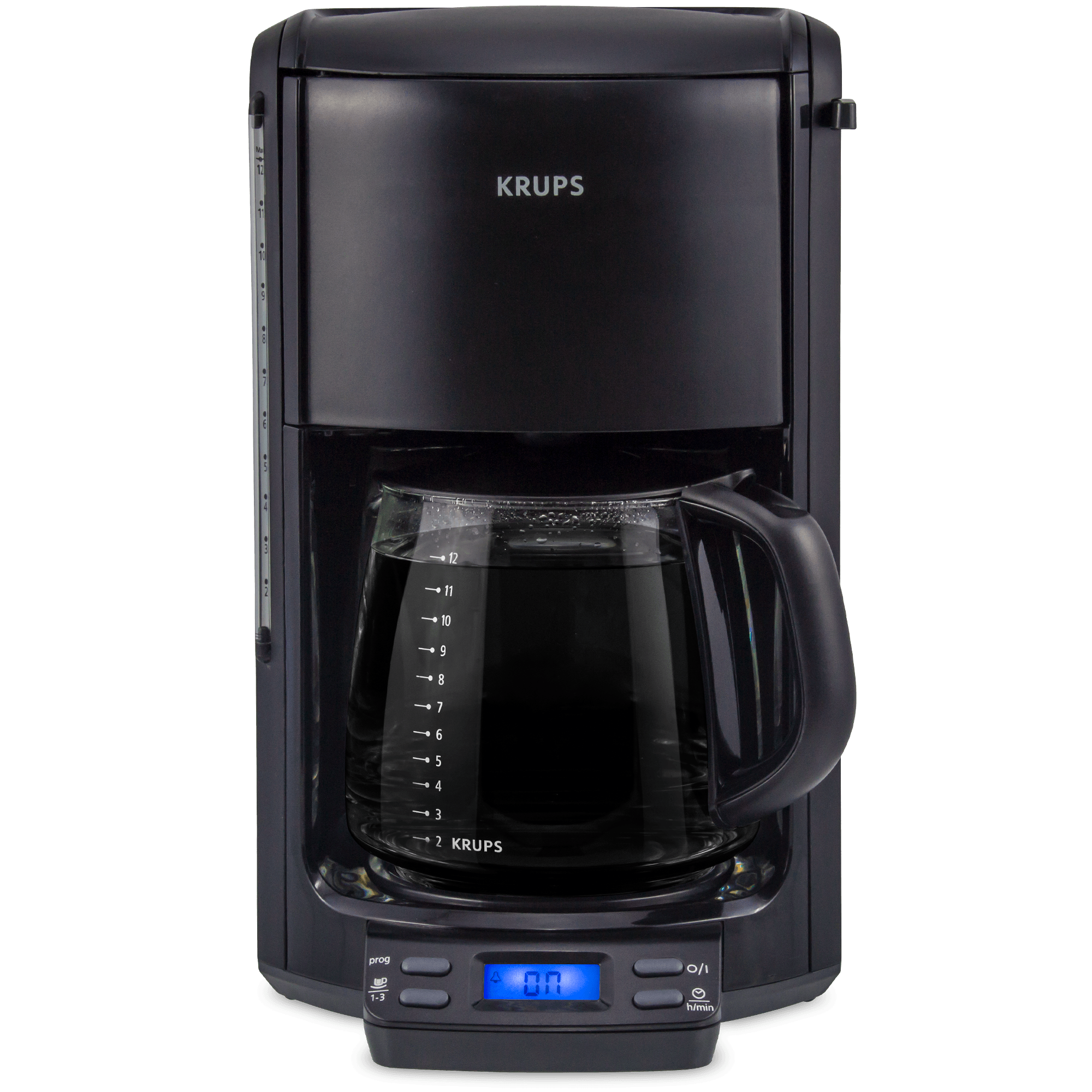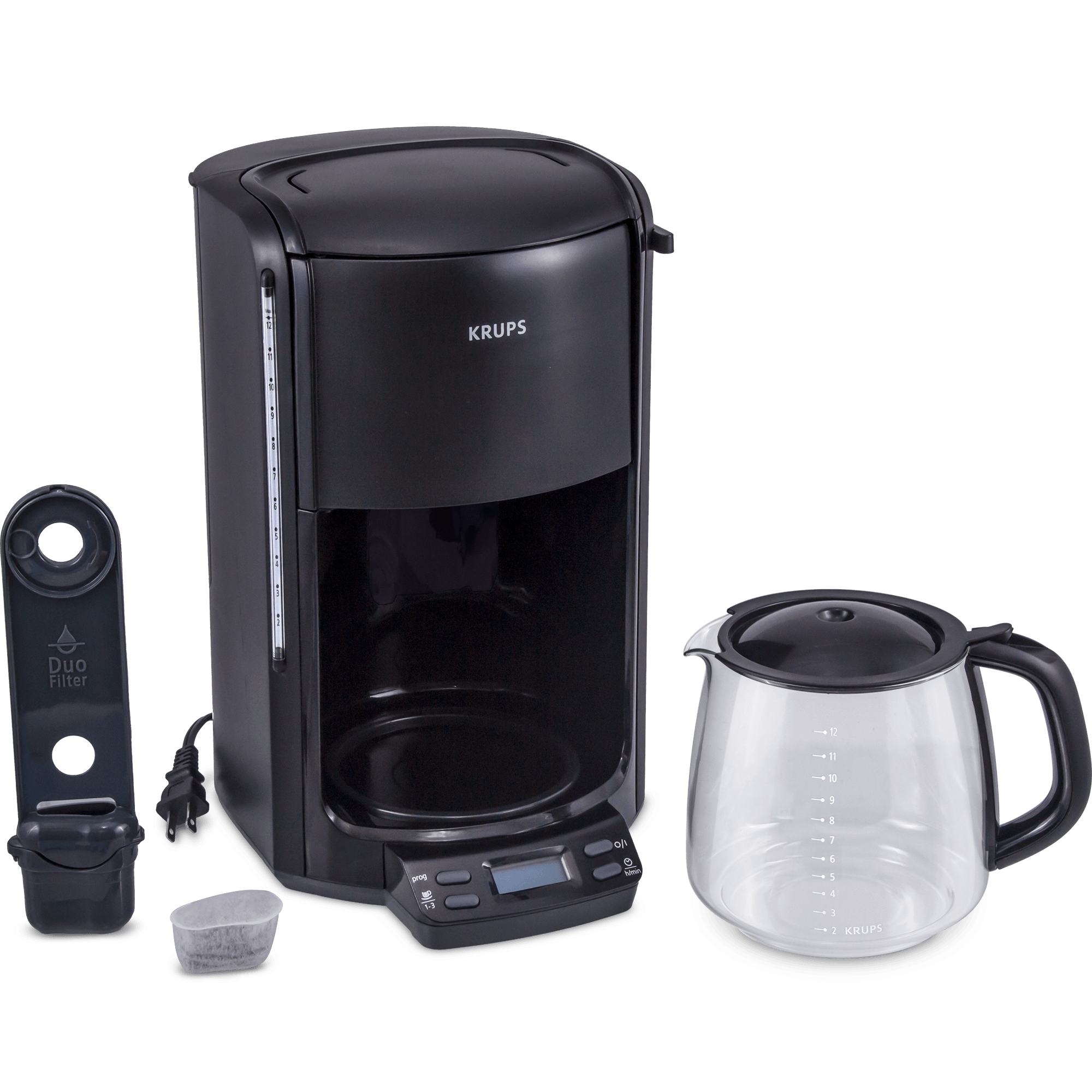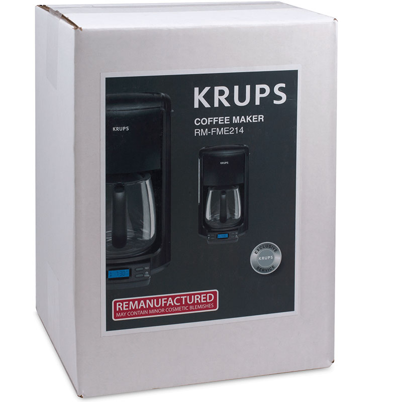 Specs ====- Model: FME214- Capacity: 12 cup glass carafe- Filters: #4 size or permanent filter (not included)- Auto On and Auto Off settings- Electronic Limescale detection indicates when unit needs to be descaled- ‘Aroma’ setting for stronger, more slowly-brewed coffee- 1-3 cup flavor setting brews smaller quantities - Pause 'n Serve stops brewing for grabbing a cup mid-brew- Optional Duofilter water filtration filters chlorine and scale for 2 months (2 pack on-brand replacements at Amazon)(6 pack off-brand replacements at Amazon)- Adjustable heating plate stays hot for 1-5 hours- Cord can be retracted into unit for storage- Wattage: 1100- User manualCondition: RefurbishedWarranty:30 Day PRCEstimated Delivery: 6/25 - 6/27Shipping: $5 or free with **VMP**What’s in the Box?====1x Krups coffee maker1x 12-cup glass carafe1x Duofilter filter1x User manualPictures ====Coffee makerEverything includedOpened top viewRetracting plugTwo parts of a complete breakfastPrice Comparison====$72 List, $59.99 (new) at AmazonFind a relevant price comparison? Please share it in a comment in this thread