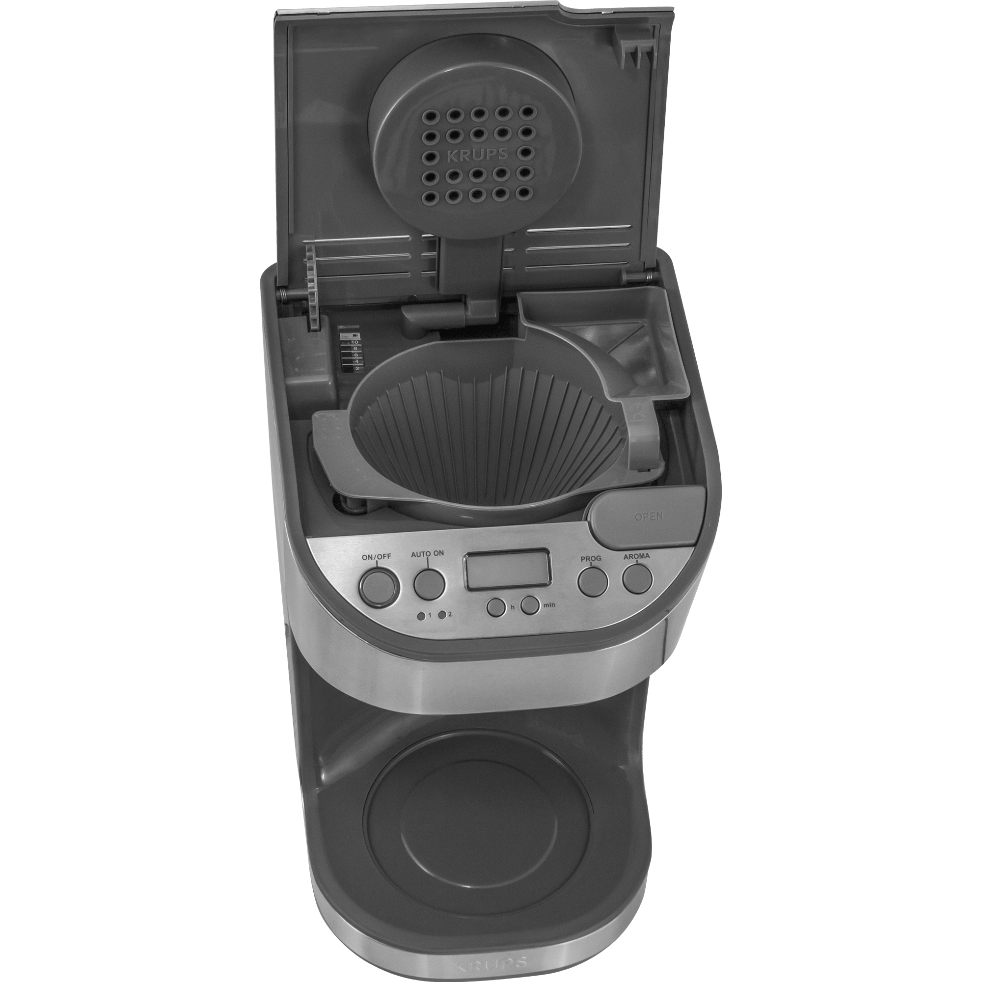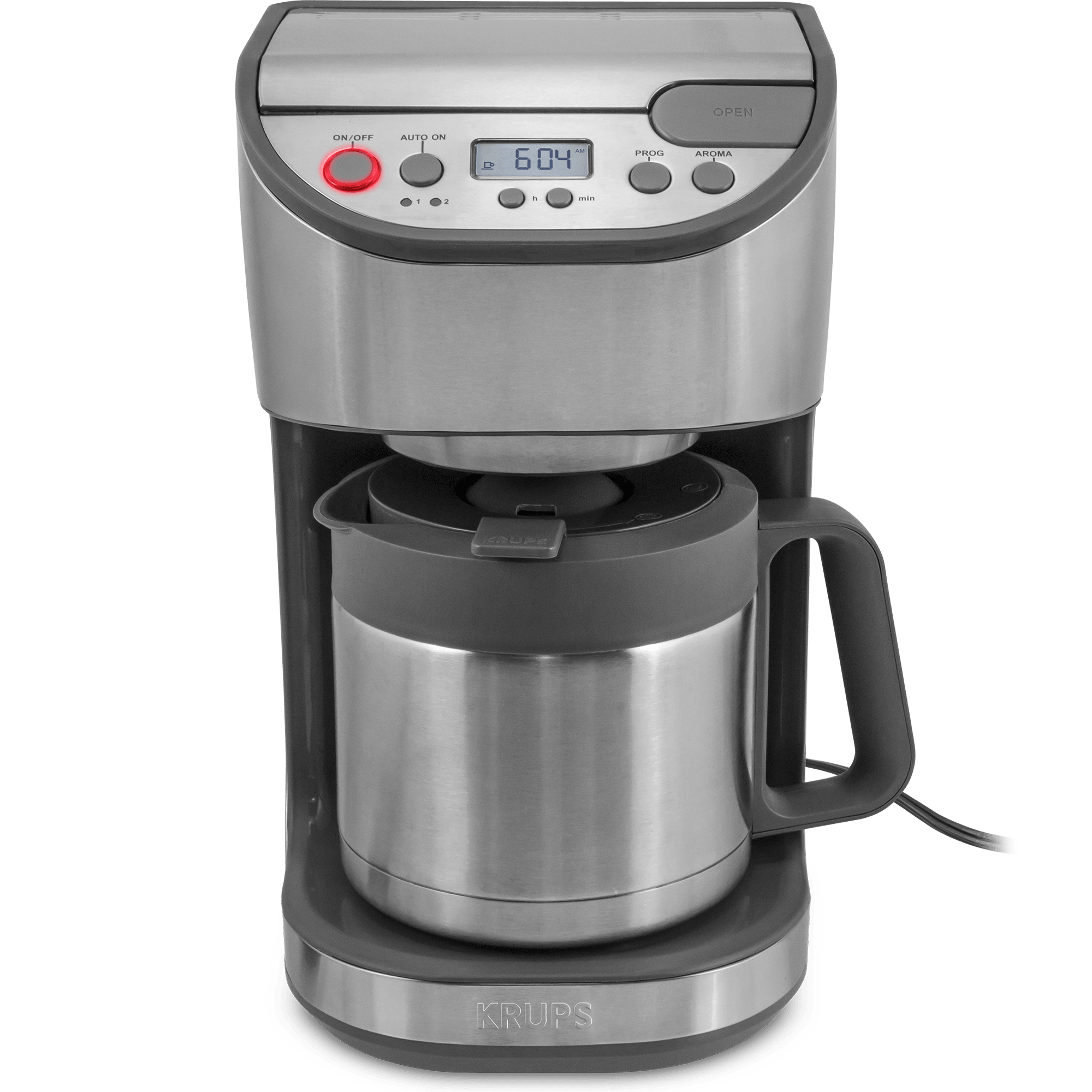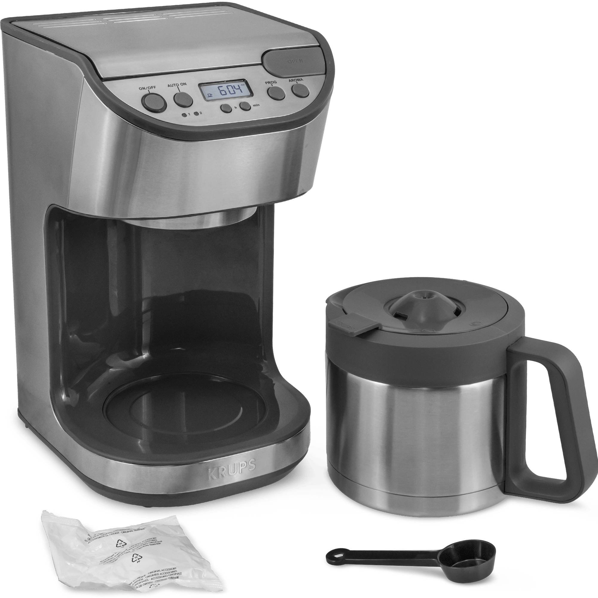 Specs ====- Model: KT611D50- Capacity: 10 cups (50 ounces)- Thermal stainless steel carafe- Extra-large (2in x 2in) showerhead for optimal extraction- Programmable with two different settings (weekday and weekend, for example)- Pause and serve- ‘Aroma’ setting brews more slowely for smaller batches or stronger coffee- Easy to read water level indicator- Lift-out brew basket- Optional Duofilter water filtration filters chlorine and scale for 2 months (2 pack on-brand replacements at Amazon) (6 pack off-brand replacements at Amazon) - Retractable cord- Dimensions: 14 x 8 x 9 inCondition: RefurbishedWarranty: 30 Day PRCEstimated Delivery: 8/26 - 8/29Shipping: $5 or free with **VMP**What’s in the Box?====1x KRUPS coffee maker1x Stainless steel carafe1x Duofilter water filter1x Coffee scoopPictures ====Coffee makerEverything includedOpened upMoose for scalePrice Comparison====$144 List, $113.95 (New) at AmazonFind a relevant price comparison? Please share it in a comment in this thread