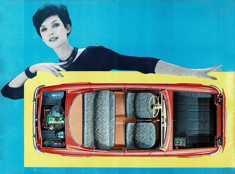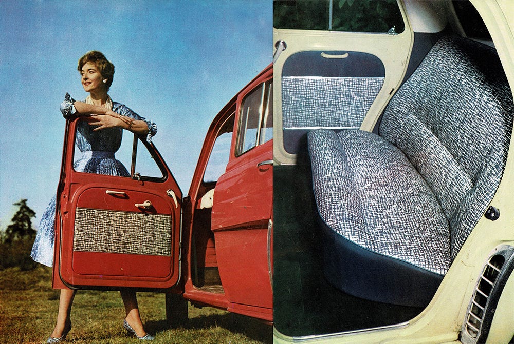 Renault, now nationalized and owned by the French government, spent five years developing an affordable, lightweight, easy-to-drive car at its facilities in the hilariously named town of Lardy. The Dauphine’s distinctive style à la française streamlined the “pontoon” or “bathtub” look of '40s cars and added unique touches like air intake vents next to the rear doors and a horizontal spare tire compartment below the front bumper. Interiors eventually came in a variety of midcentury textile patterns and color schemes. Like I said, I’m not a car guy, but if they still looked like this, maybe I would be.