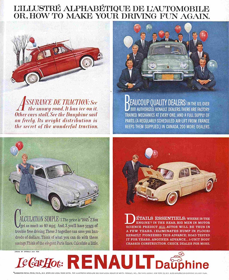 A growing reputation for unreliability - shared with other French and Italian cars of the time - was exacerbated by a lack of parts and dealerships. Simple repairs would take weeks. Renault ran into the same chicken-and-egg problem that stymied other carmakers: you can’t sell a lot of cars without a robust service network, but it’s hard to build a robust service network until you sell a lot of cars.