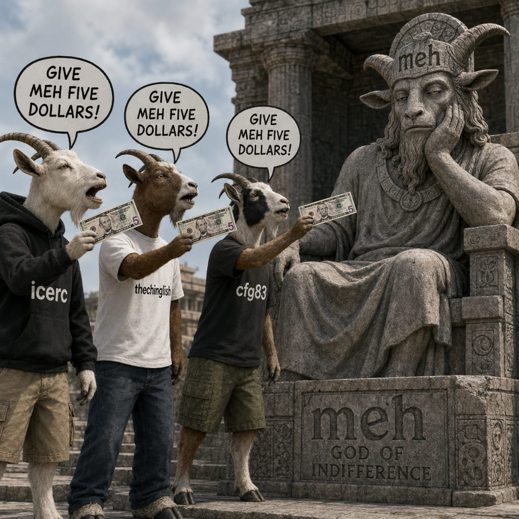 /showme Three anthropomorphized goats named icerc, thechinglish, and cfg83 demanding to give five dollar bills to a stone statue of a god called meh.