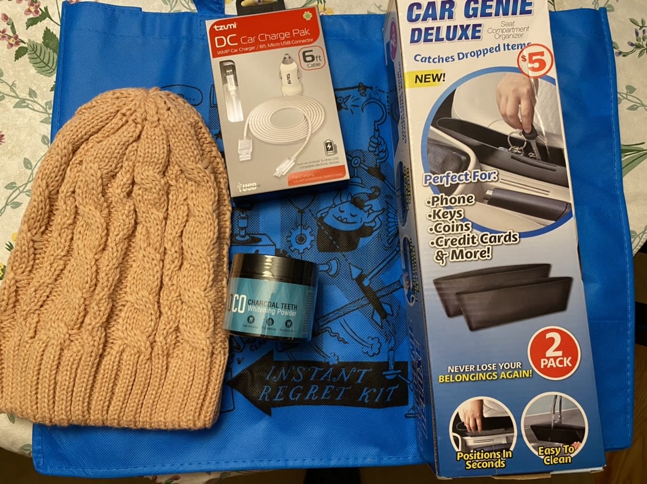 Small ripple mug with small grip, natural essential oils, some sort of face covering do-dad I will have to open to figure out, a slouchy Beanie (not normally necessary in North Carolina coast, lol), cake plates for displaying cakes I don’t make, and a red IRK bag!