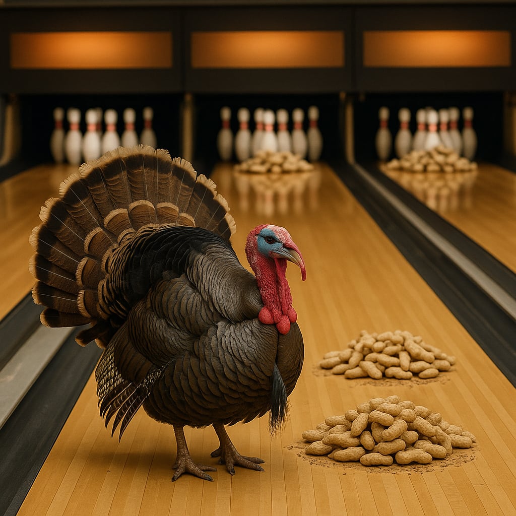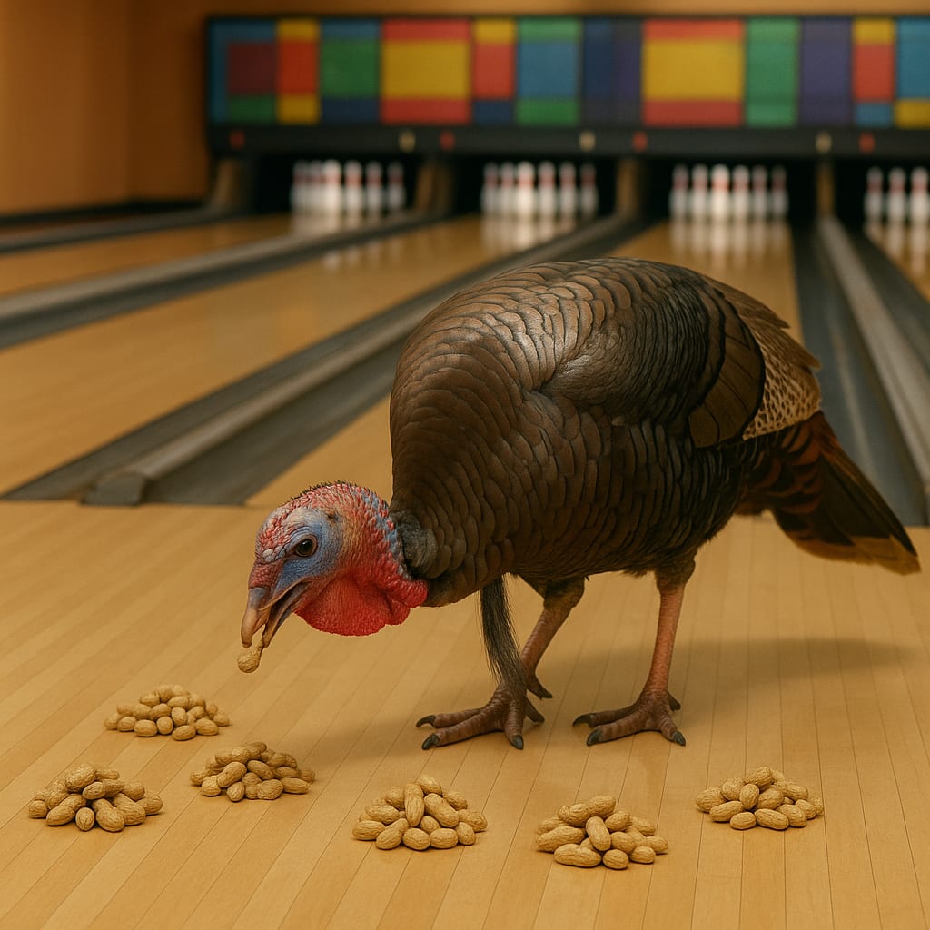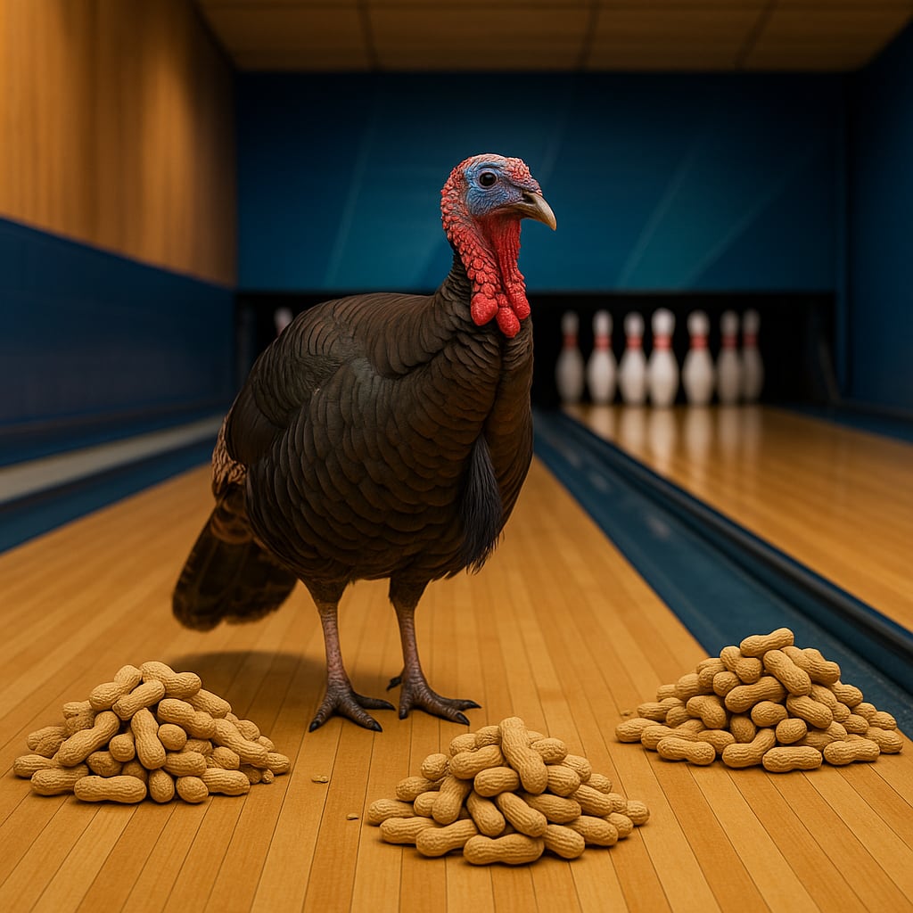 @cfg83@mediocrebot@phendrick I think the ancient mystery remains hidden because I actually see FOUR piles of peanuts in my pic, and there may be a hidden pile behind Mr. Turkey’s spread tail feathers! I believe @mediocrebot believes Bowling is done is a Honky Tonk setting where patrons toss peanut shells on the floor. Let me try another prompt: