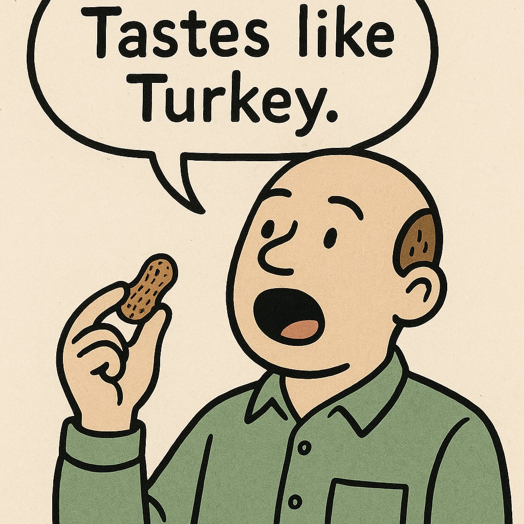 /showme person eating peanut and saying “Tastes like Turkey”.