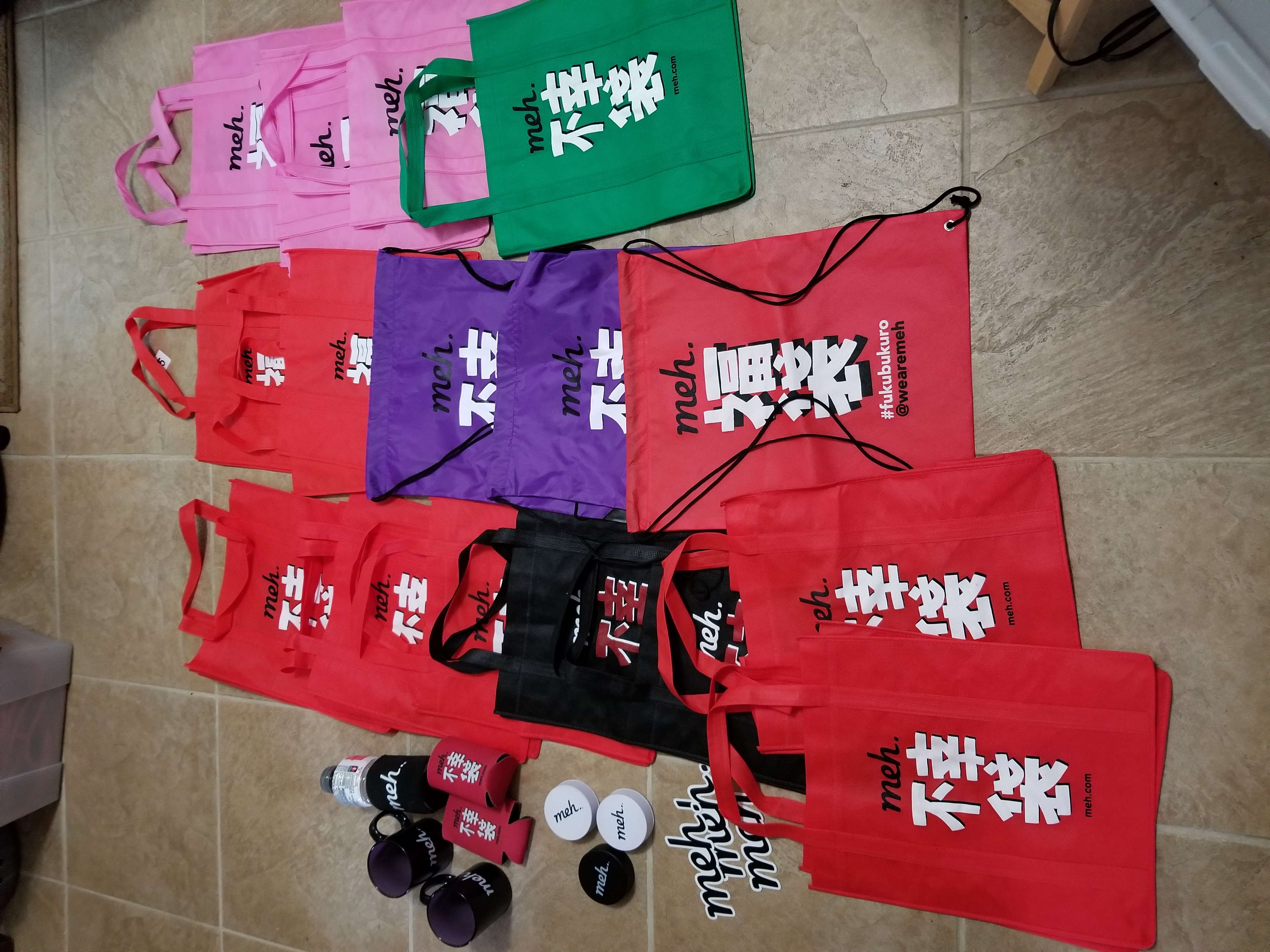 Impressive. I have given some away during the mehrican exchanges and so my collection is looking rather anemic. I see you need the purple drawstring, the black fanny pack, the orange bag and a fuku bag to make your collection more complete (did I miss any?)… Maybe if you beg and plead?