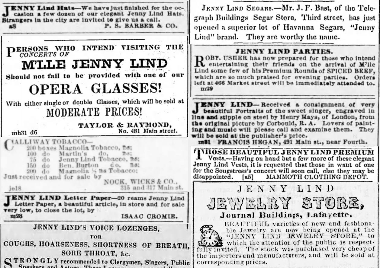 Literally from the moment Lind’s ship docked in New York, Barnum peddled a full range of official merchandise. Forget t-shirts: we’re talking lamps, pianos, portraits, sheet music, perfume… and whatever class of goods Barnum didn’t think of, other hustlers did. “Intellectual property” wasn’t much of a concept in 1850. Jenny Lind’s name was gold, and the profiteers of this cut-throat age didn’t hesitate to cash in on it. Everywhere she went - and she went a lot of places during her 18-month sojourn through that old, weird America - local vendors invoked Jenny Lind to cast an aura of class and quality over their wares.