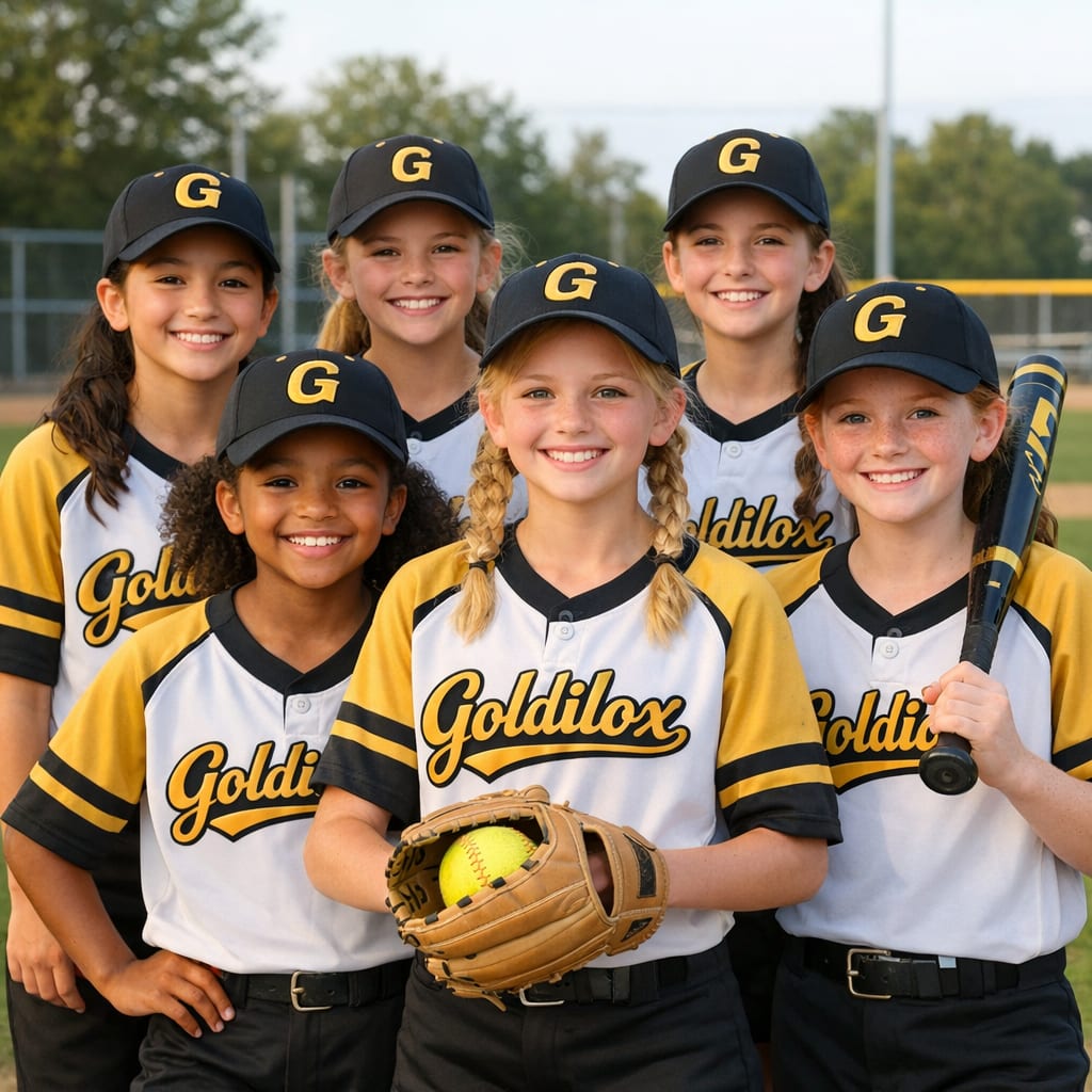 @cfg83 Here’s the image you requested for “little league baseball girls team called Goldilox with medium sleeve baseball jerseys.”