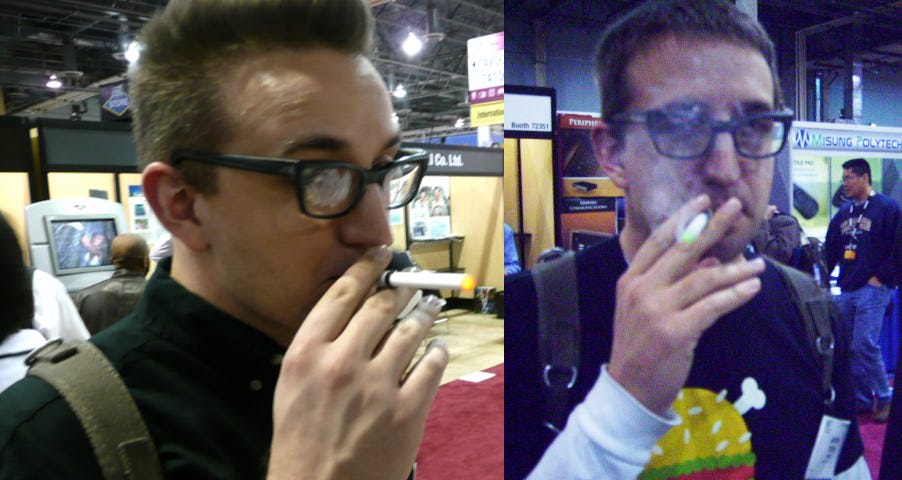 So, in 2008, when I spotted a guy puffing away on what seemed to be some sort of cyber-Sharpie, I stopped to check out his booth. This thing was way bigger than a cigarette, and crowned with an orange LED. I asked him if he was allowed to smoke that here, and he told me he wasn’t smoking. Those clouds weren’t toxic cigarette smoke but harmless vapor! That’s how I met Njoy, the first vape I’d ever seen.
