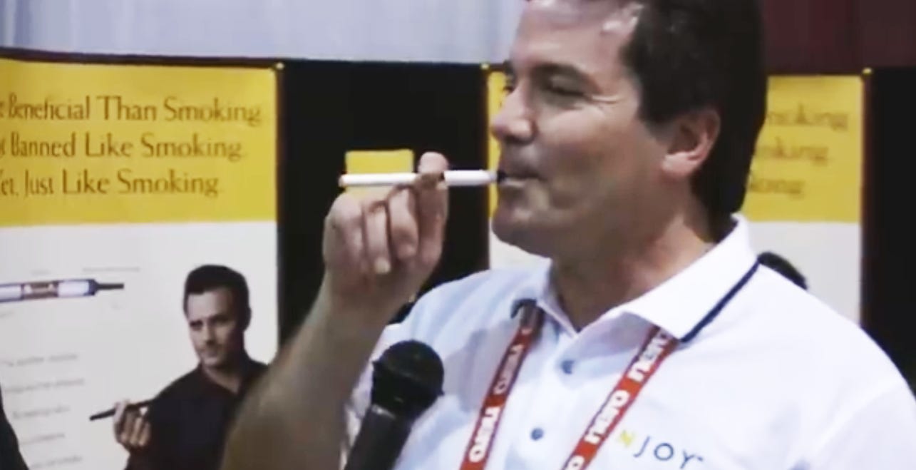 YouTuber Jake Ludington did a video interview that year at the same booth, where the unnamed Njoy rep touts the legality of vaping everywhere. “I can smoke this anywhere: on the airplane, I can smoke it in the CES show, in government buildings, and I can still enjoy my nicotine.”