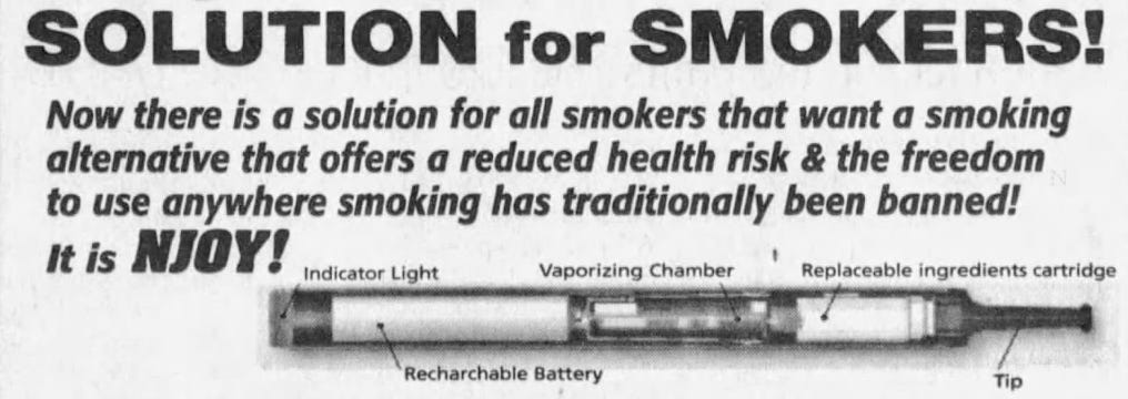 But I was obviously into the concept, explaining Njoy as “a cigarette-shaped nicotine vaporizer that satisfies one’s jones without causing any inconvenient cancers, producing any nasty odors, or hurting those around you with secondhand smoke.” Then I just had to be a dick and say “But if smoking became harmless, what would the priggish scolds of the world do with their time?” Yeah, how dare those pushy anti-smokers try to save people’s lives?