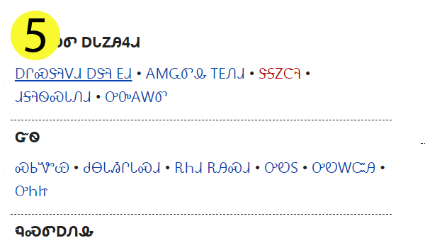5 https://chr.wikipedia.org/wiki/ᎤᎵᎮᎵᏍᏗ (Really? The main page? No apples now? There is an article about apple in Cherokee)