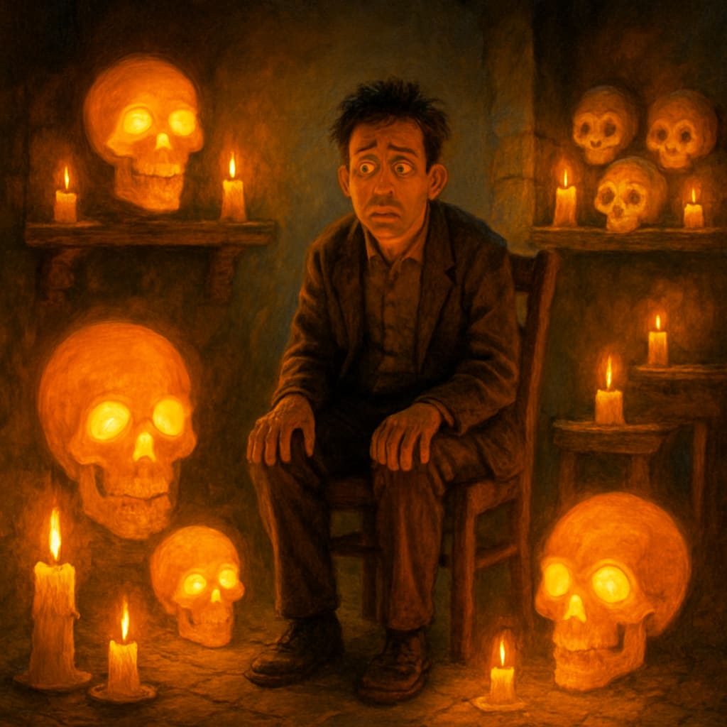 /showme room with glowing skulls and candles everywhere and befuddled person sitting on a chair in the middle of the room.