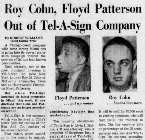 Anyway, for whatever reason, Cohn and heavyweight champ Floyd Patterson got out of their investments in Tel-A-Sign just as the Scopitone deal was happening - all of those things were announced in the same 1964 Miami Herald article. There’s probably a story there that we’ll never know.