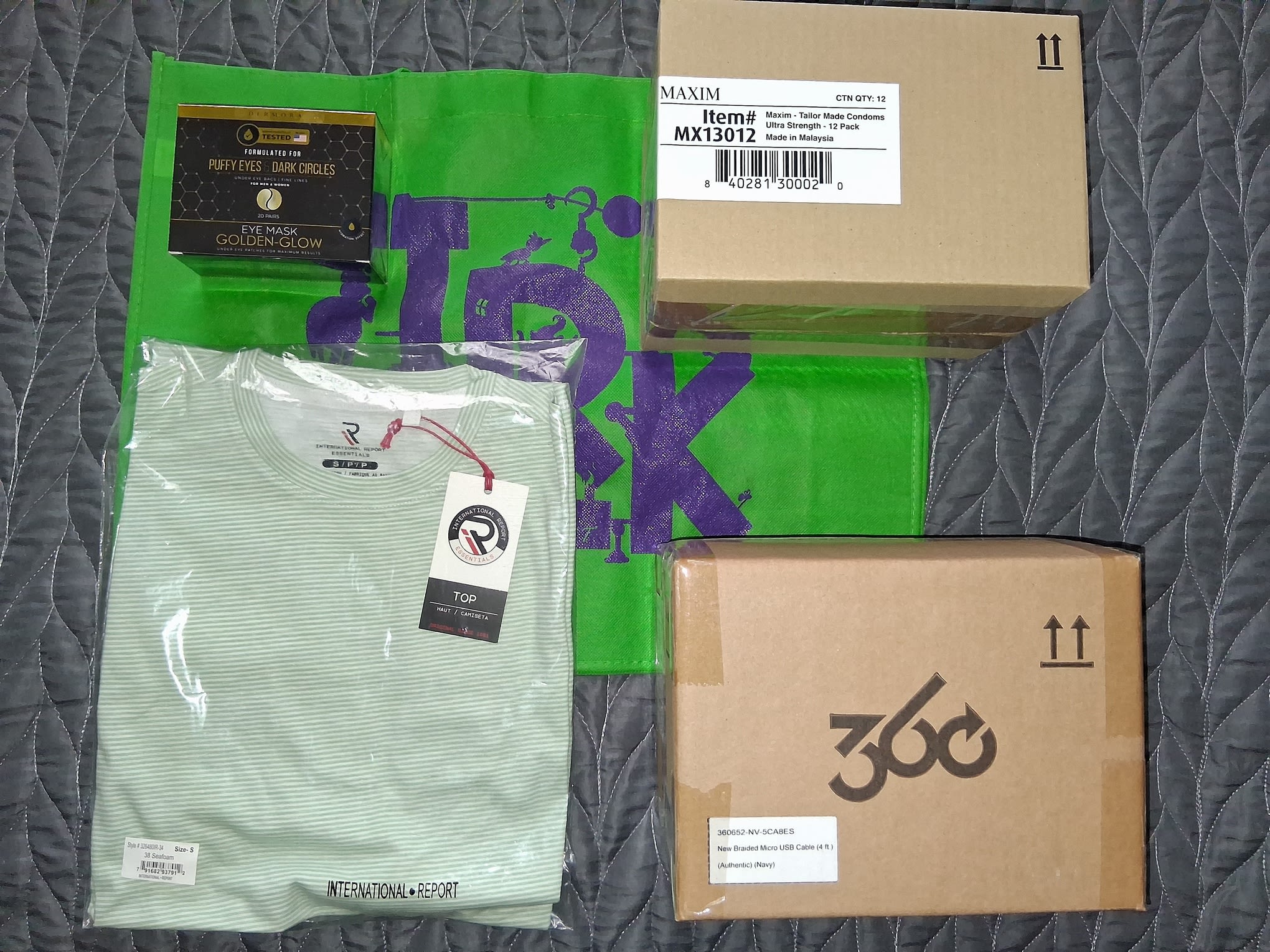 2 multi-packs of microfiber kitchen towels, 2 boxes of condoms, 1 jar of bee face serum, and 1 queen size comforter and pillow set. Can’t stand touching microfiber, no need for condoms, wife might enjoy serum, but the comforter might fit in an old folks home maybe? I am whelmed.