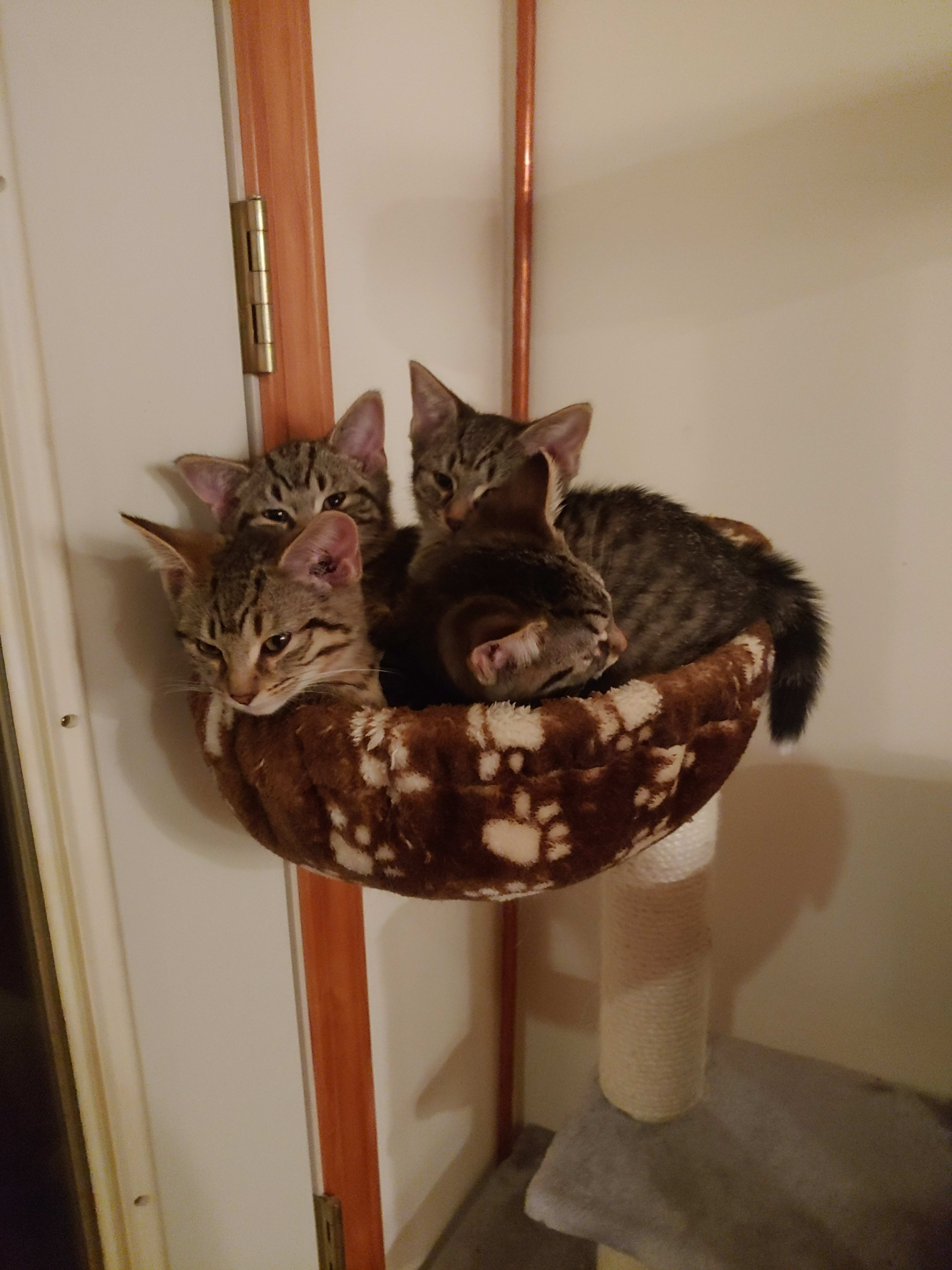 @Kyeh Shortie, Georgia, and Fuzzers are from Riley’s first litter of kittens on 6/8/2018. Sam Hooker, Stephanie Plum, Bear, and Ghost are from her second litter on 10/13/2018. In a four month period she had 13 kittens. Once her second litter were weened she was spayed. She was suppoed to be spayed after her first litter but she escaped. She was good mama cat but she was too good at her job.