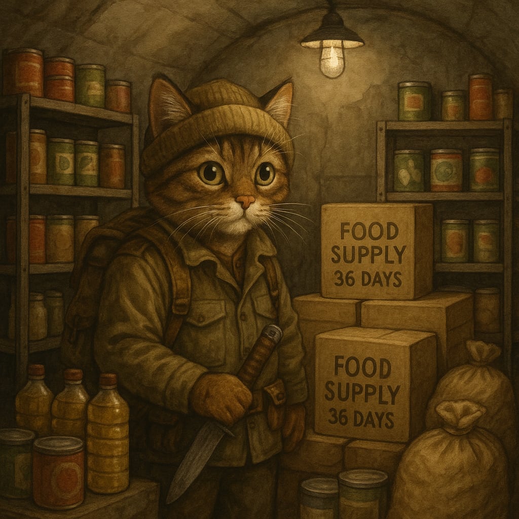 /showme Anthropomorphized kitty cat survivalist in bunker with 36 day supply of food.