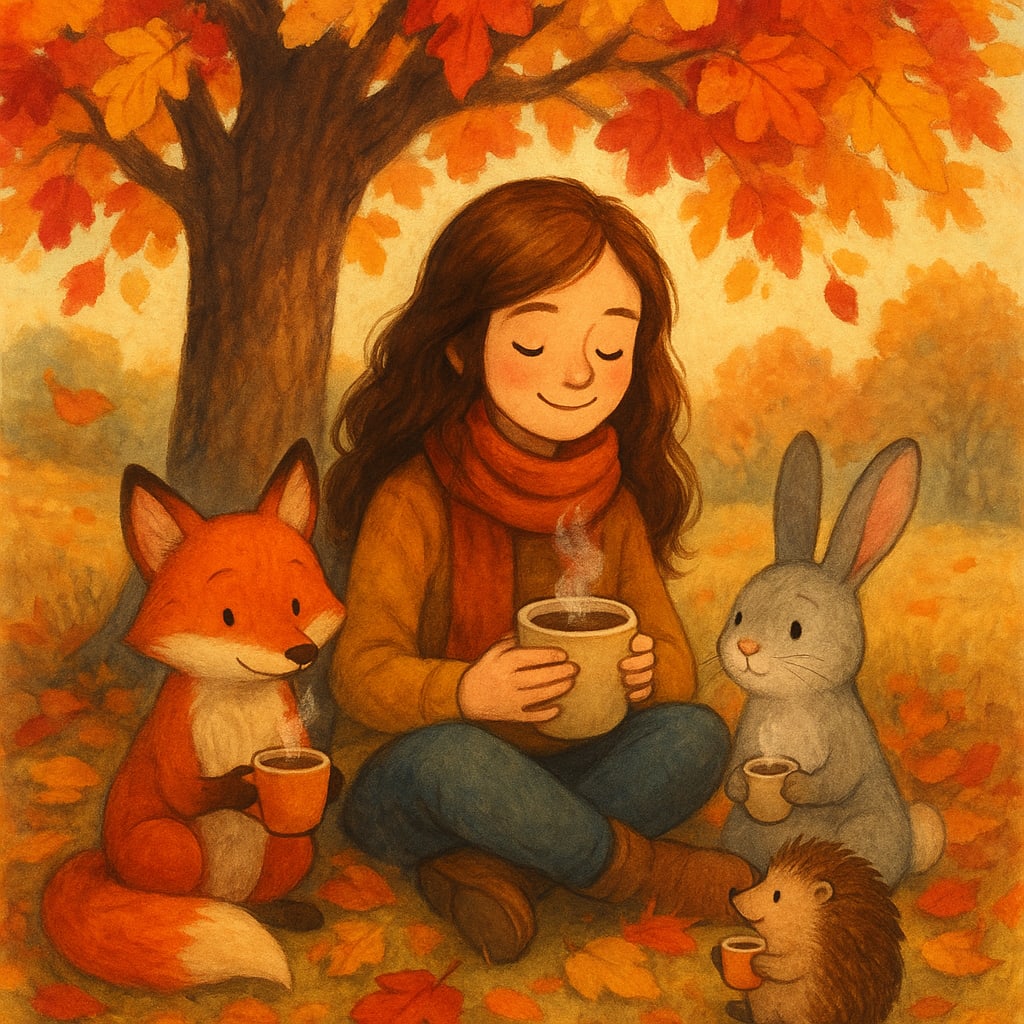 /showme siting under a colorful autumn tree enjoying hot chocolate with my animal friends