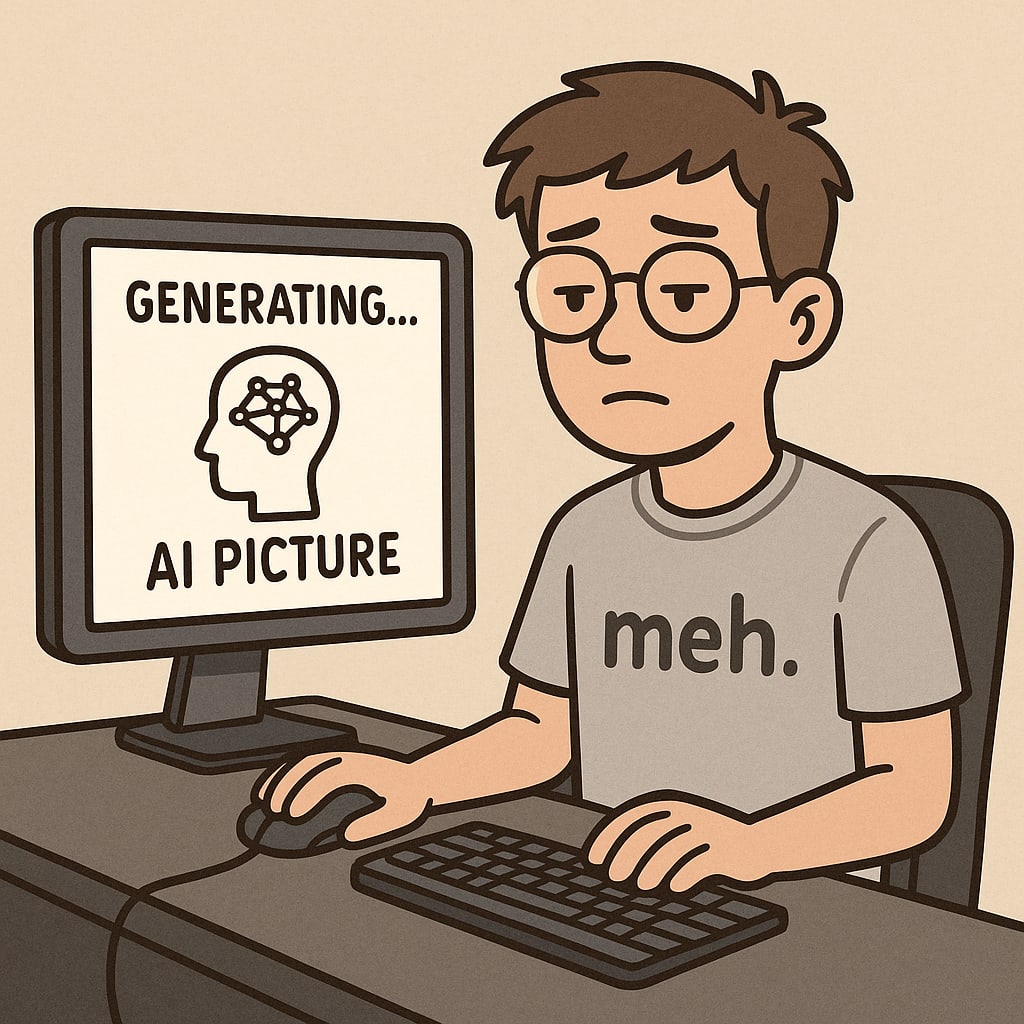 /showme a member wearing a meh shirt working at the computer trying to generate an AI picture