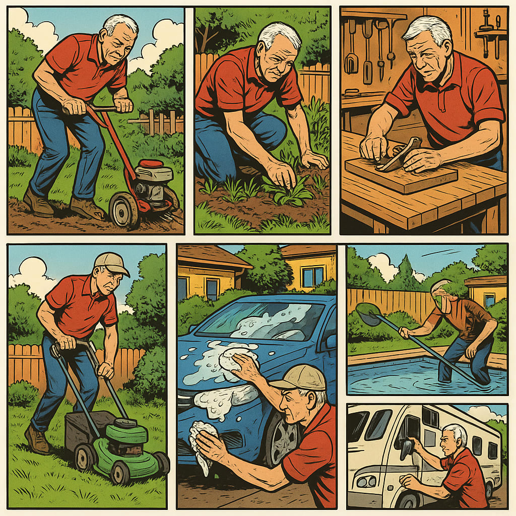 /showme a 70 year old working outside tilling soil, weeding his garden, working in a wood shop, mowing his lawn, washing his car, cleaning his pool and working on his RV in comic book style with multiple panels.