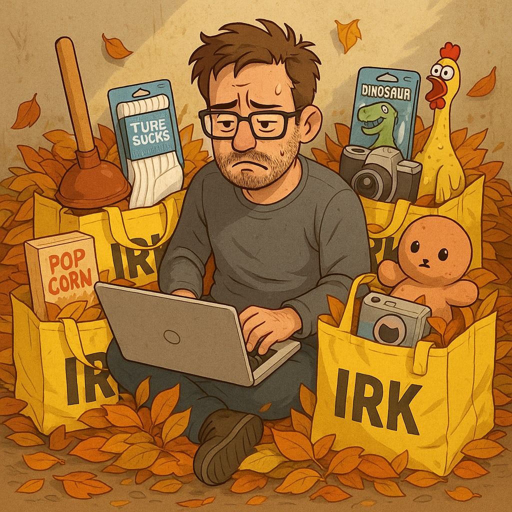 /showme a beleaguered copywriter working on a laptop in a pile of leaves while surrounded by yellow reusable grocery bags with “IRK” written on the side and random silly retail products inside.
