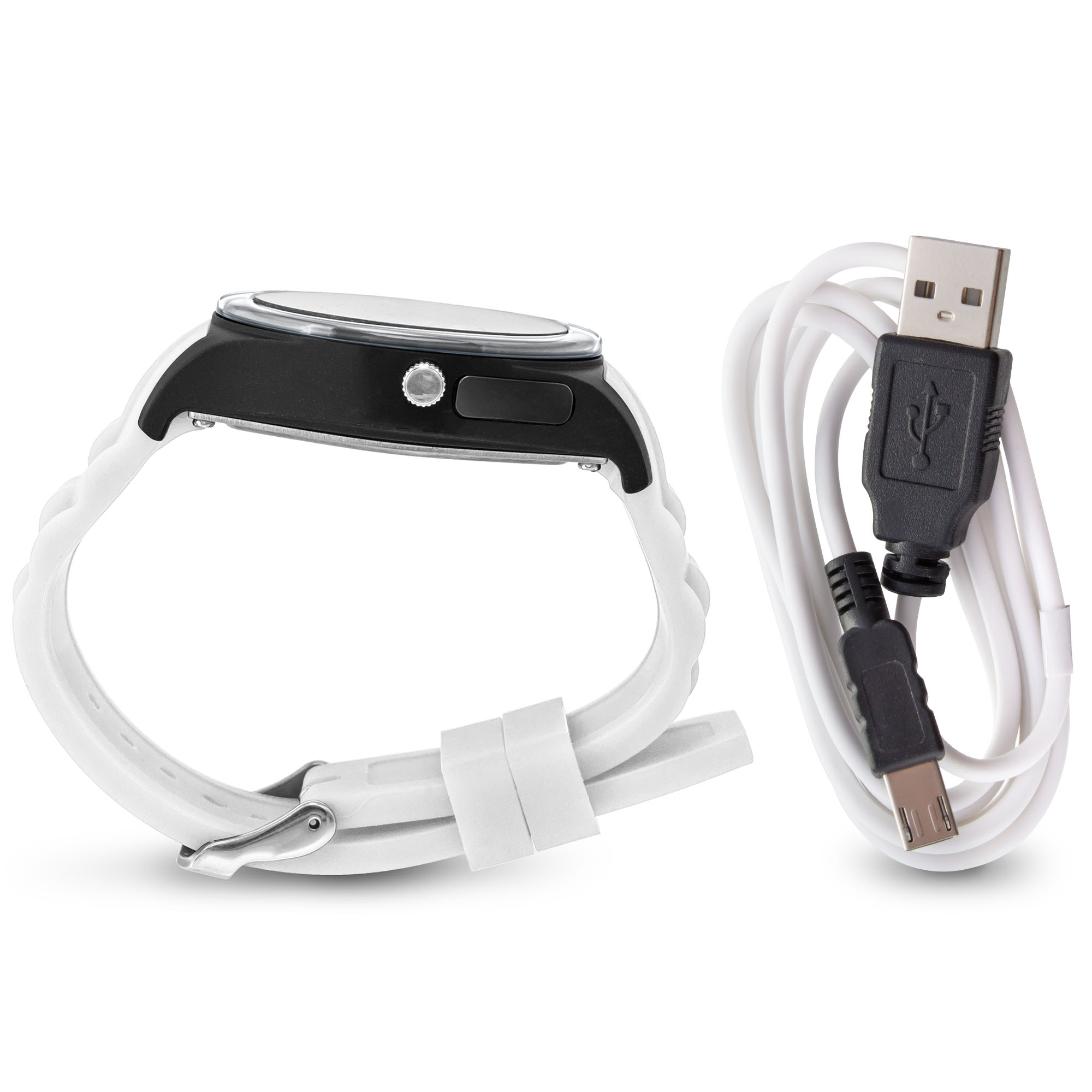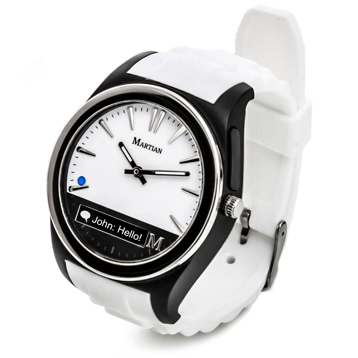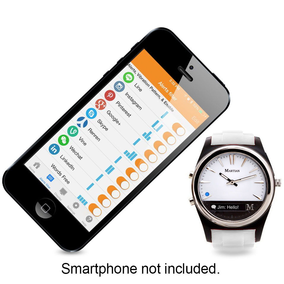 Specs ==== - Model: MN200BBB, MN200RBR, MN200WBW - App notifications from social media, news, fitness, sports, and other apps - Customizable vibration patterns - Remote camera shutter control - Silent alarms - Wireless leash vibrates if you leave your phone - Find your phone by tapping on your watch to make it ring - Digital world clock - Analog quartz watch with Japanese movement - Upper Command Button - Lower Select Button - 96 x 16 pixel graphic OLED display - Bluetooth 4.0 chip (classic Bluetooth and Bluetooth low energy) - RGB LED light - Light Touch Vibrating Motor - 3-Axis Accelerometer - Silicone band with stainless steel clasp - Band Width: .87 inches (22mm) - Band Length: 8.19 inches (20.8cm) - Band Fits: 5.75 8.0 inch (15.24 21.6cm) wrist - Band Thickness: .14 inches (3.5mm) - Anti-scratch acrylic crystal - Micro USB port for recharging and firmware updates Power: - 7 days of use time (separate analog watch battery will run for up to 2 years) - Built-in lithium polymer rechargeable battery - Up to 2 hours charging time - Charging via USB to computer or power adapter Compatible with: - iPad Air, iPad mini, iPad (3rd generation), iPhone 6, 6 Plus, 5, 5C, 5S, 4S - Android Phones and Tablets 3.0 or later - Quick connect guide - iOS user manual - iOS app - Android app - Android user manualCondition: New Warranty:1 Year MartianEstimated Delivery: 1/22 - 1/24Shipping: $5 or free with VMP What’s in the Box? ==== - Martian Notifier Watch - Micro USB Cable - Quick Connect Guide Pictures ==== OptionsPaired with your phoneWhiteSide view of whiteBlackSide view of blackRedSide of red Price Comparison ==== $38.95 for Red (fulfilled by Amazon)$36.25 for Black (fulfilled by Amazon)$34.99 for White (fulfilled by Amazon)$85.02 for White (sold by Amazon)Find a relevant price comparison? Please share it in a comment in this thread