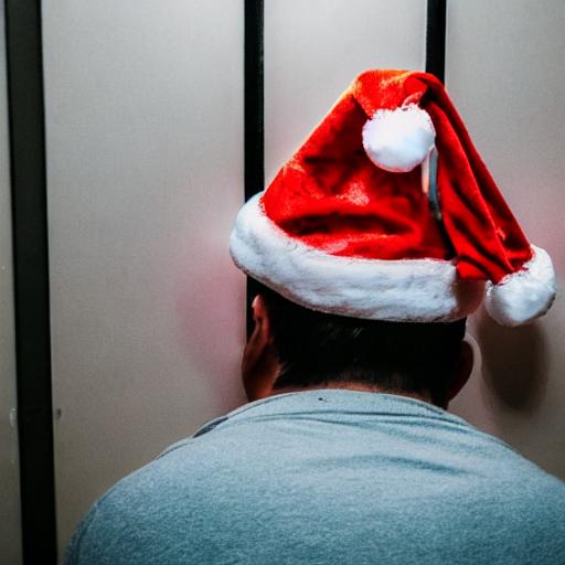 /showme disgusted person wearing a Santa hat looking over a bathroom stall --steps 75