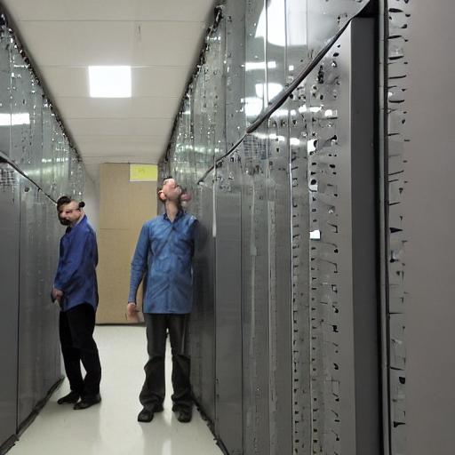 /showme disgusted humanoid web server puking nuts and bolts, medz looking pleased in the background, in a server room