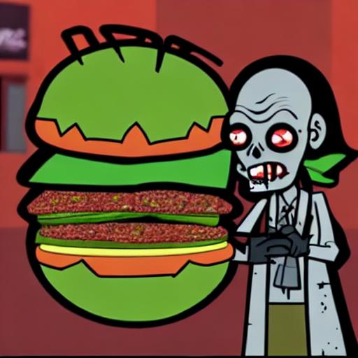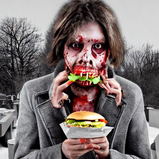 /showme a zombie eating a juicy burger at a McDonald’s restaurant in a stark wasteland
