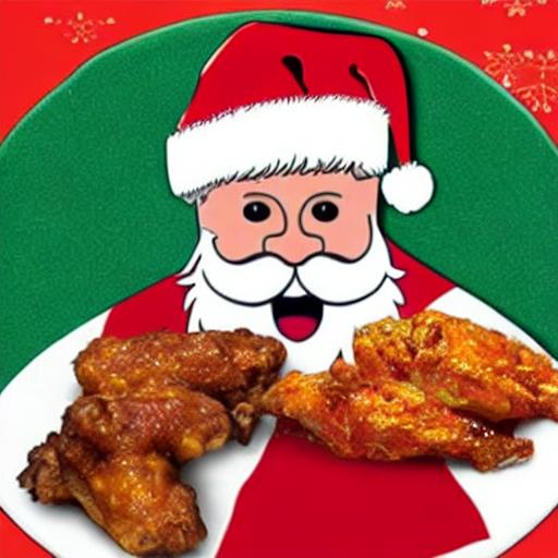/showme Santa Claus eating hot wings in a Pizza Hut, sauce in his beard