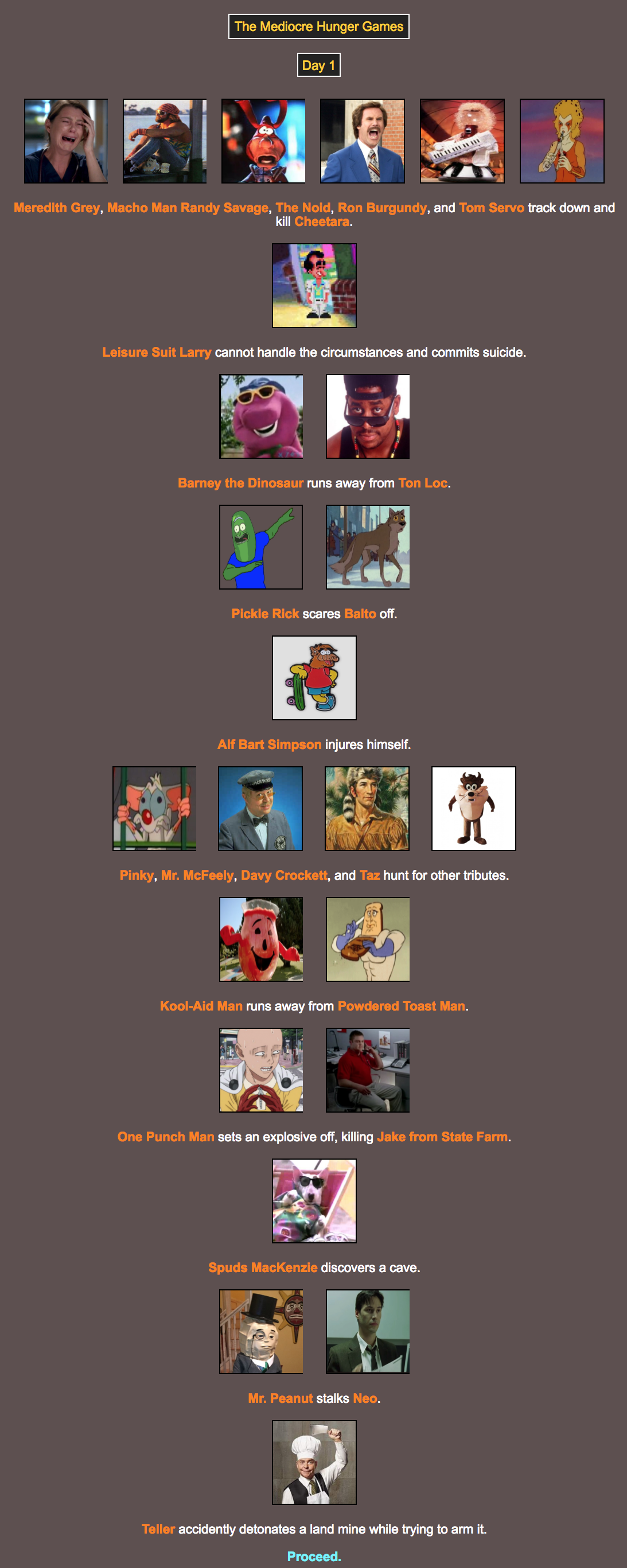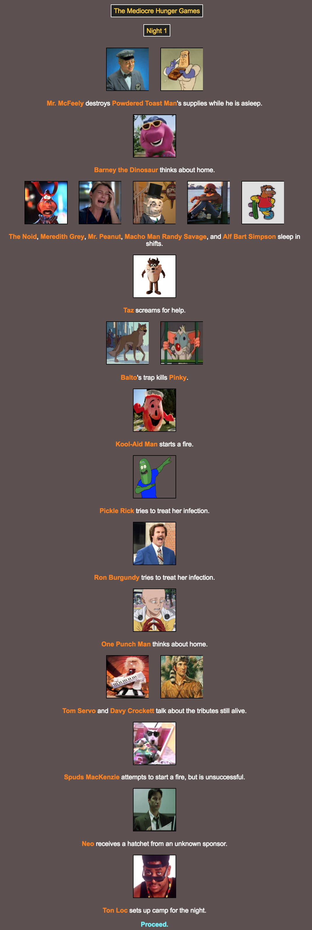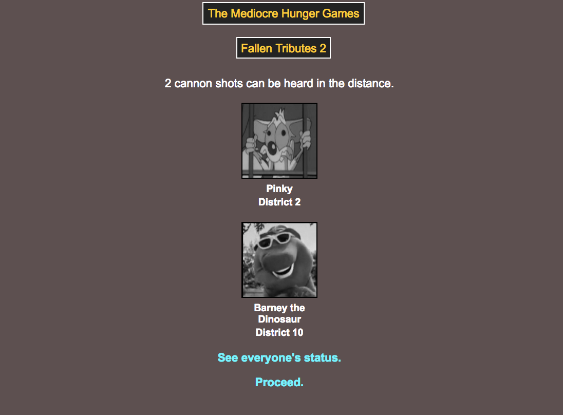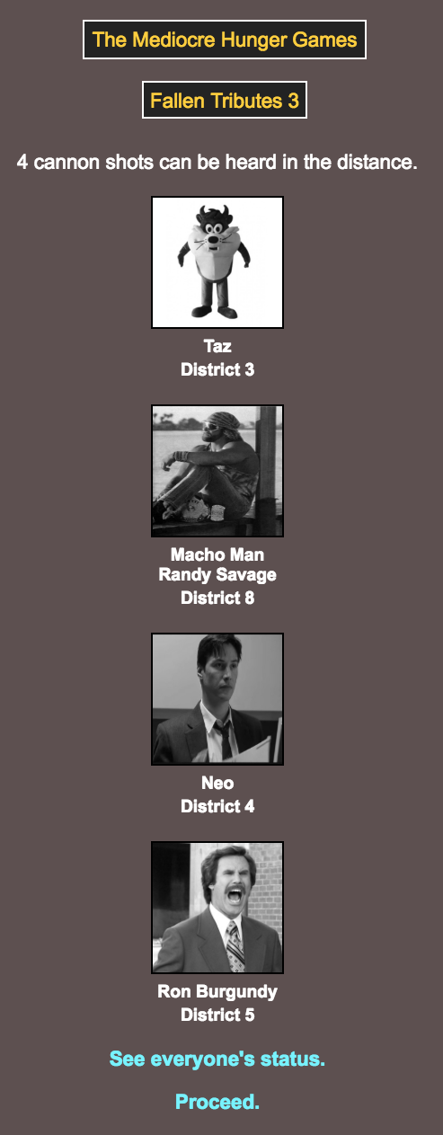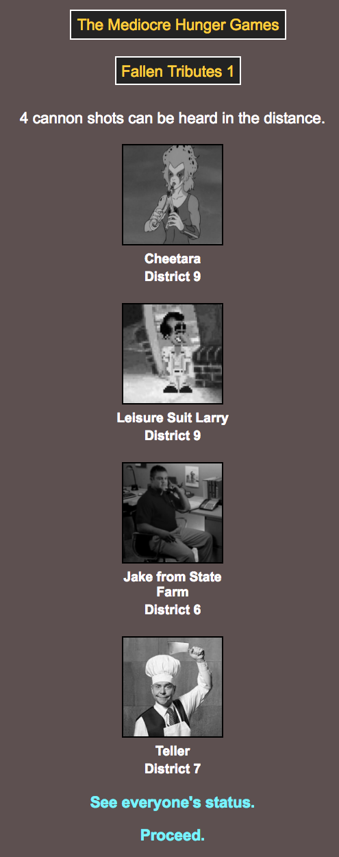 The citizens of Mediocre have chosen their champions, and I am pleased to announce the start of the Mediocre Hunger Games!