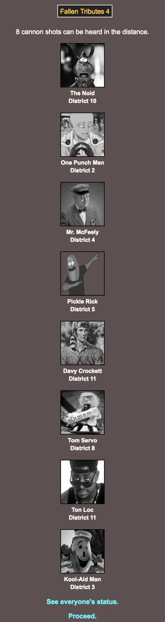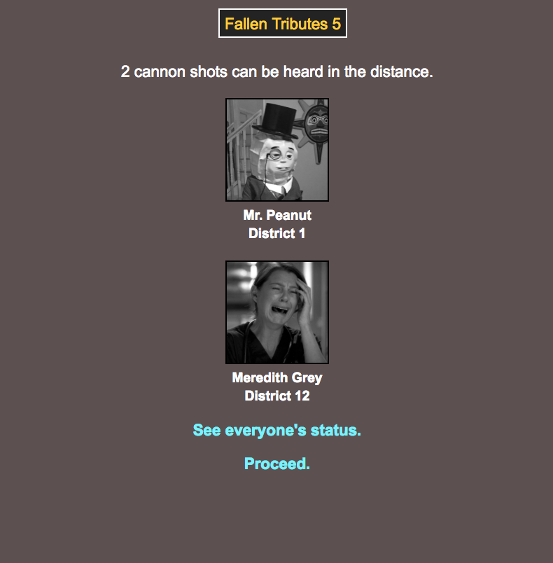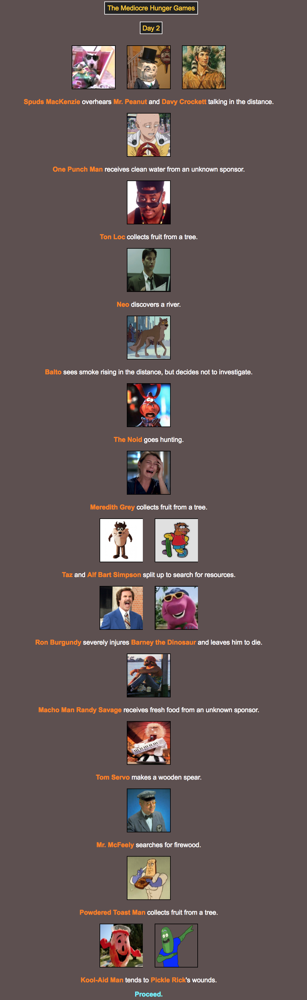 This is all powered by BrantSteele’s Hunger Games simulator. It simulates a Hunger Games experience, all it needs is a cast of characters, which the meh community has generously provided. I will be going through and posting updates on how everyone fairs throughout the coming days, so stay tuned and give us your commentary!