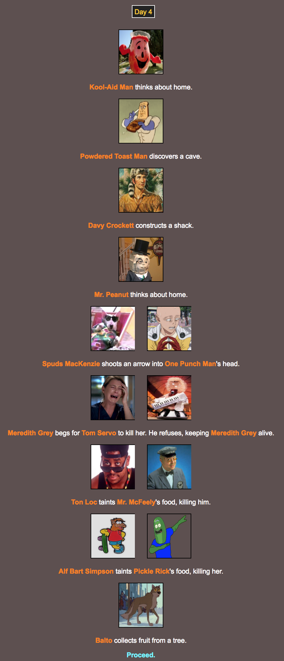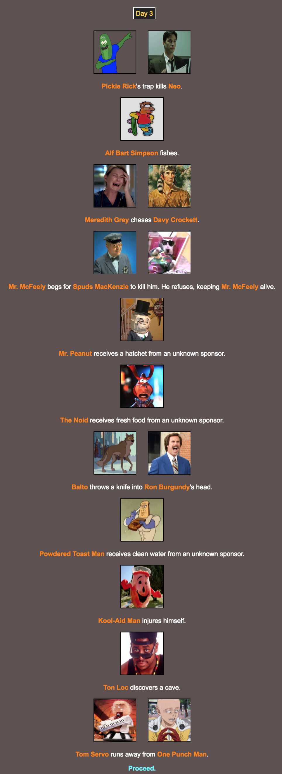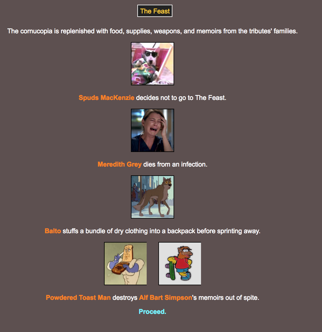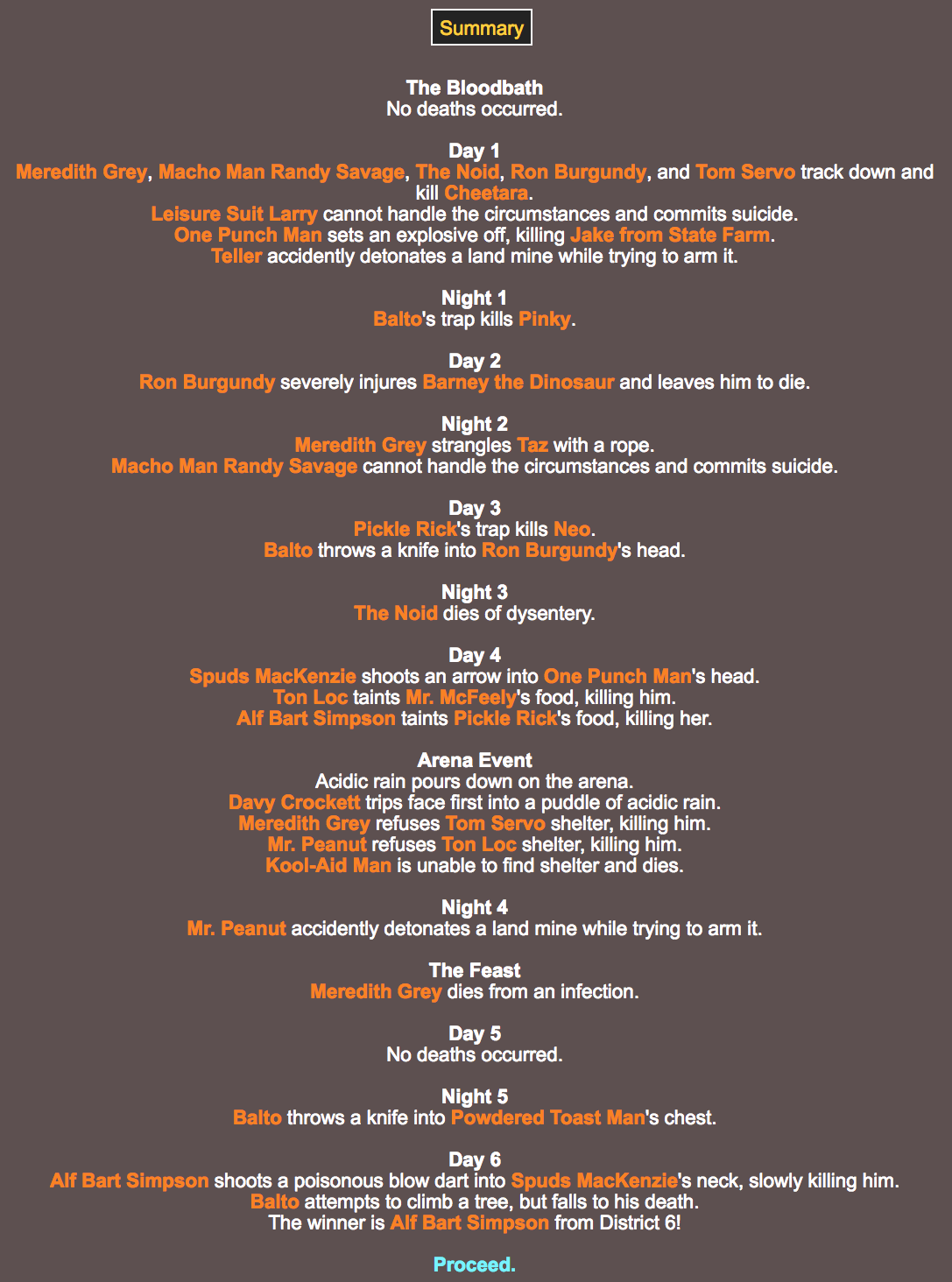 If you would like to replay this yourself, you can use this link: http://brantsteele.net/hungergames/r.php?c=Wd9TgJE0