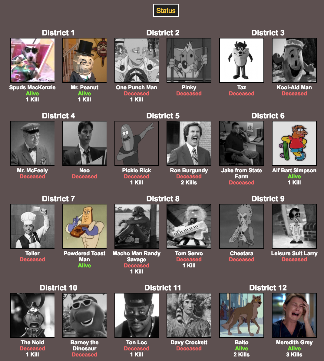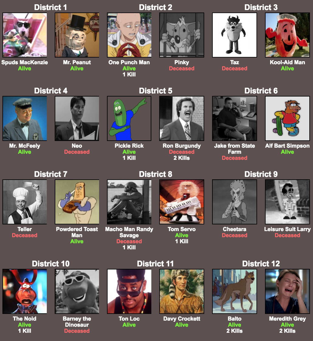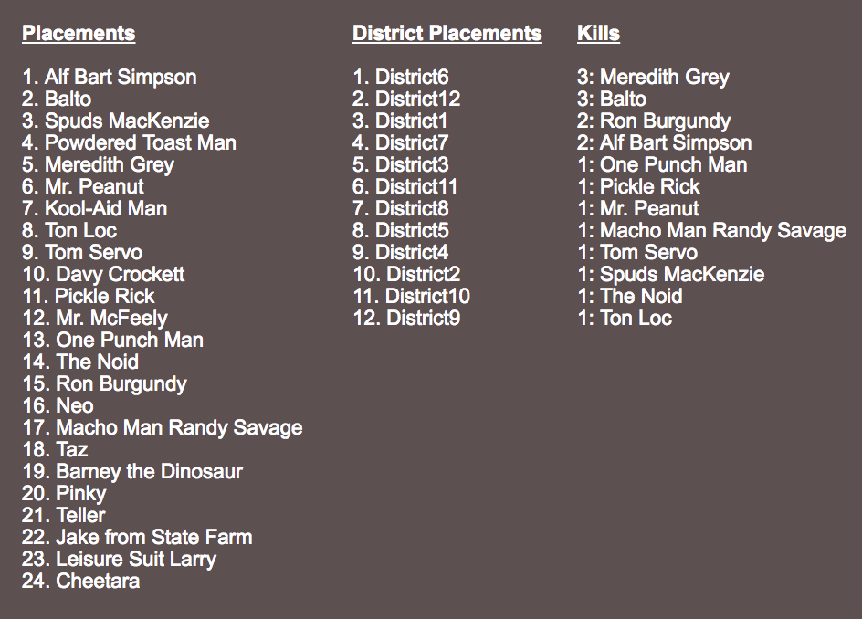 I’m not sure why District 6 (Alf Bart and Jake From State Farm) gets first place; Sure, Alf Bart was the only survivor, but Jake died on Day 1 and District 12 (Meredith Grey and Balto) got a third of all the kills! District 12 got robbed. They should protest or something.
